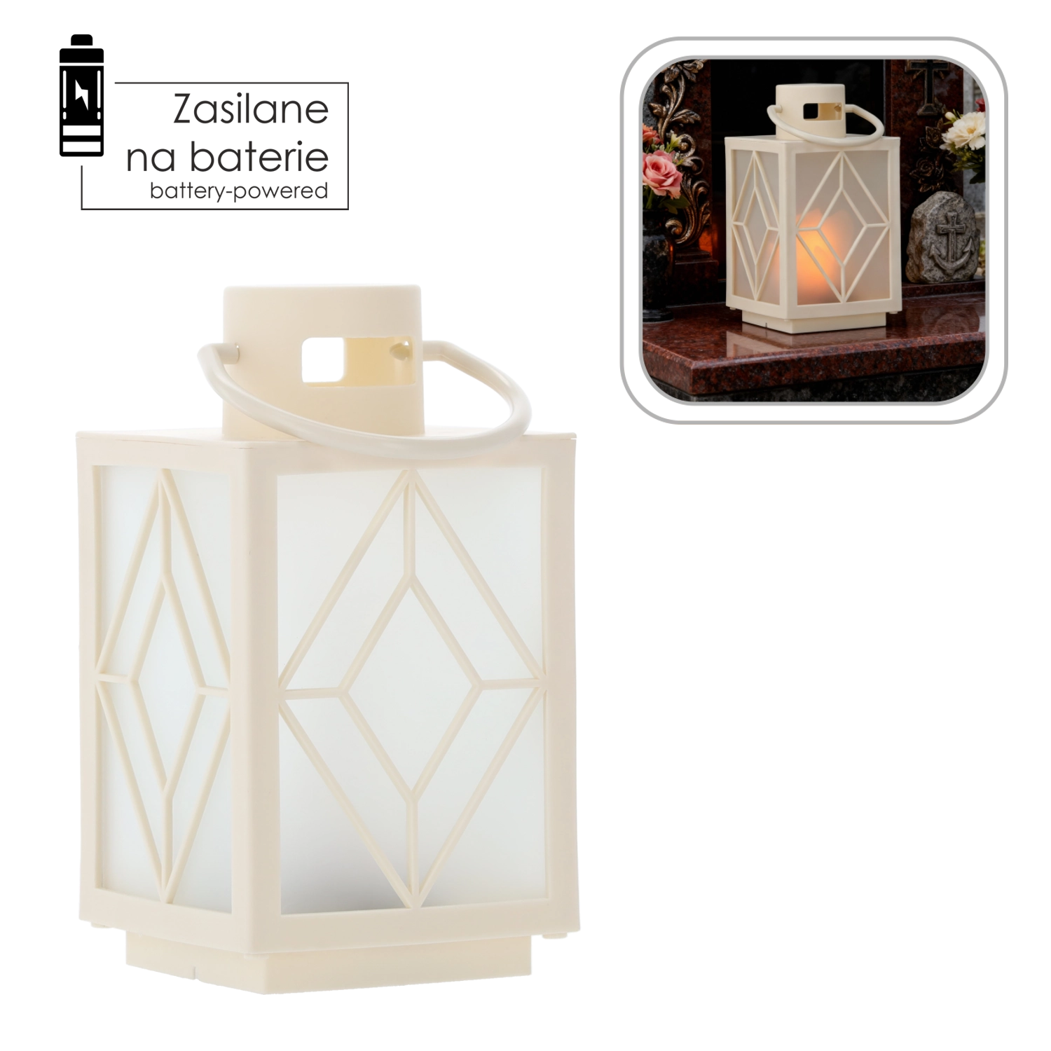 Grâce à l’alimentation par piles, le lampion est entièrement portable – posez-le facilement sur une étagère, une terrasse ou un monument funéraire. La poignée solide permet la suspension et un changement rapide d’emplacement selon vos besoins.