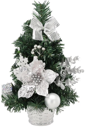 Le sapin est pré-décoré avec des boules, des rubans et des accessoires argentés : il suffit de le placer. Le pot stable fait partie du coffret, ce qui permet à la décoration de rester bien en place sur diverses surfaces. Des matériaux de qualité — plastique, fil métallique et textile — garantissent une longue durée de vie et une bonne résistance, pour vous accompagner durant de nombreuses saisons.
