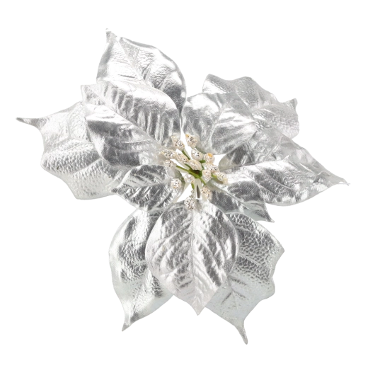 Élégante étoile de Noël (poinsettia) artificielle d’une hauteur de 25 cm en finition argentée, apportant une touche festive et scintillante à votre intérieur. Un matériau de qualité imite fidèlement l’aspect de la fleur naturelle et le clip pratique permet une fixation facile sur le sapin, les couronnes, les guirlandes et autres décorations.