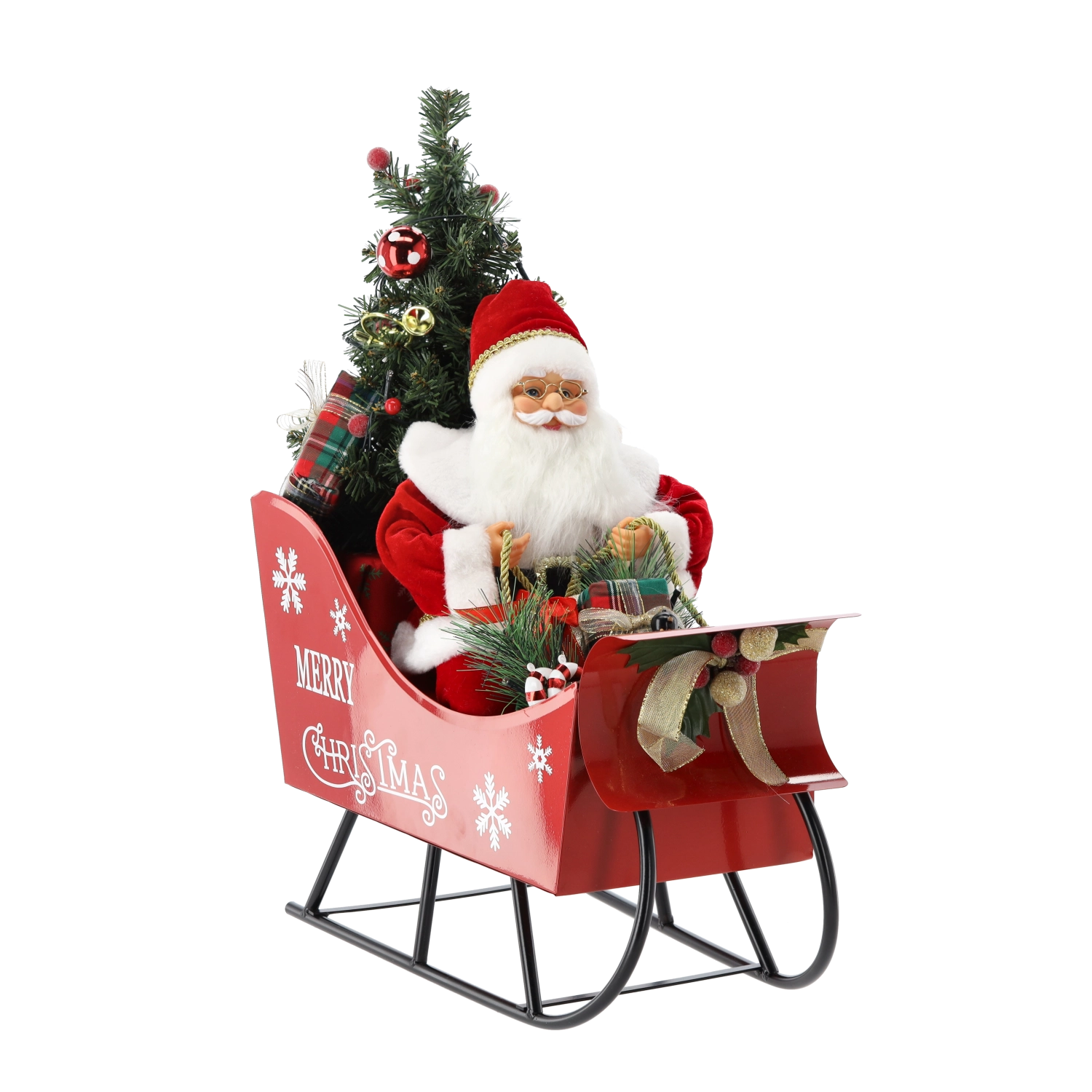 • Design élégant – traîneau rouge classique, cadeaux et sapin orné de décorations.