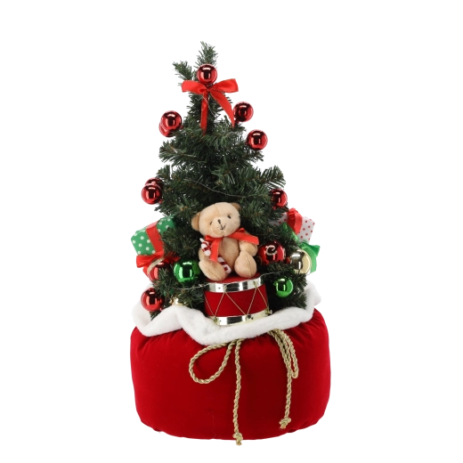 Le sapin est orné de décorations rouges et vertes, de petits nœuds et de charmants ornements : il suffit de le déballer et de l’exposer.