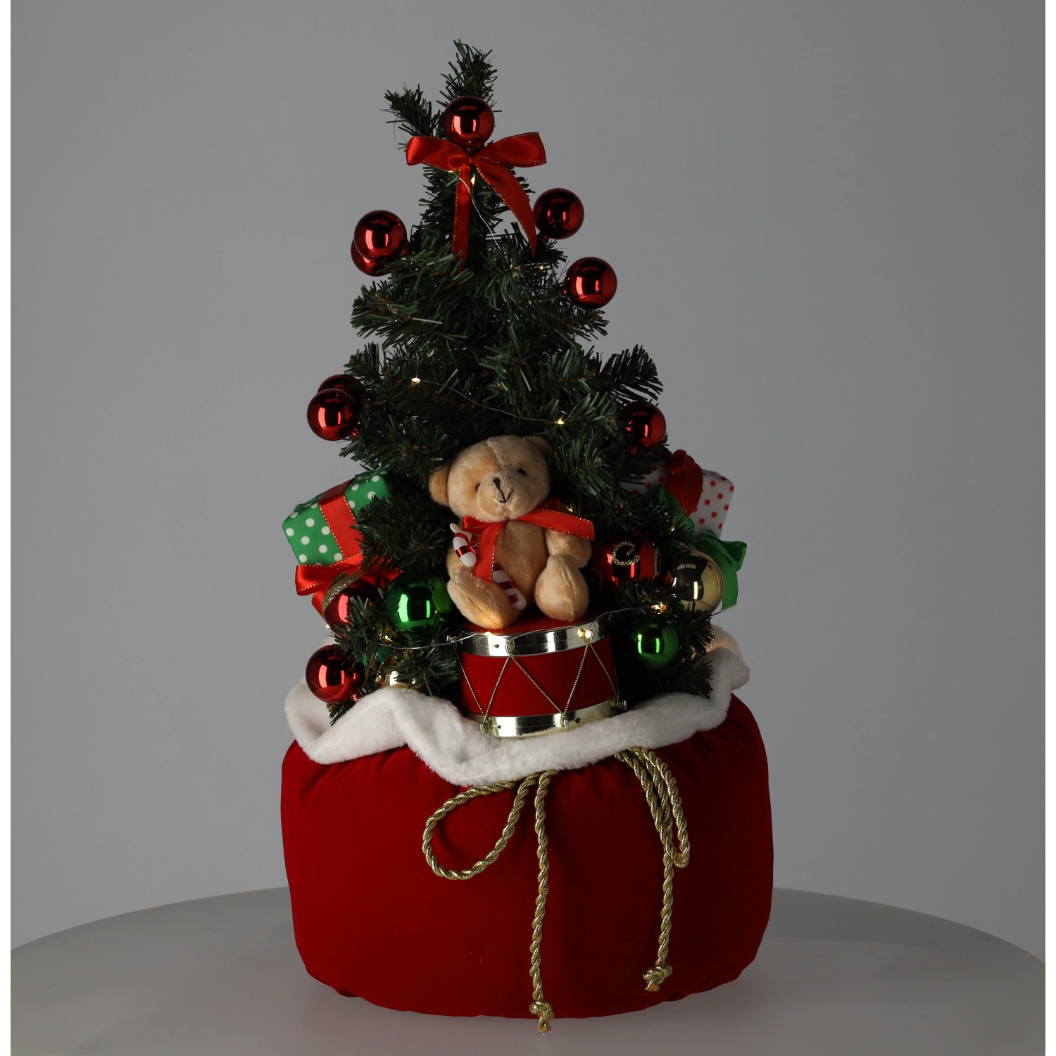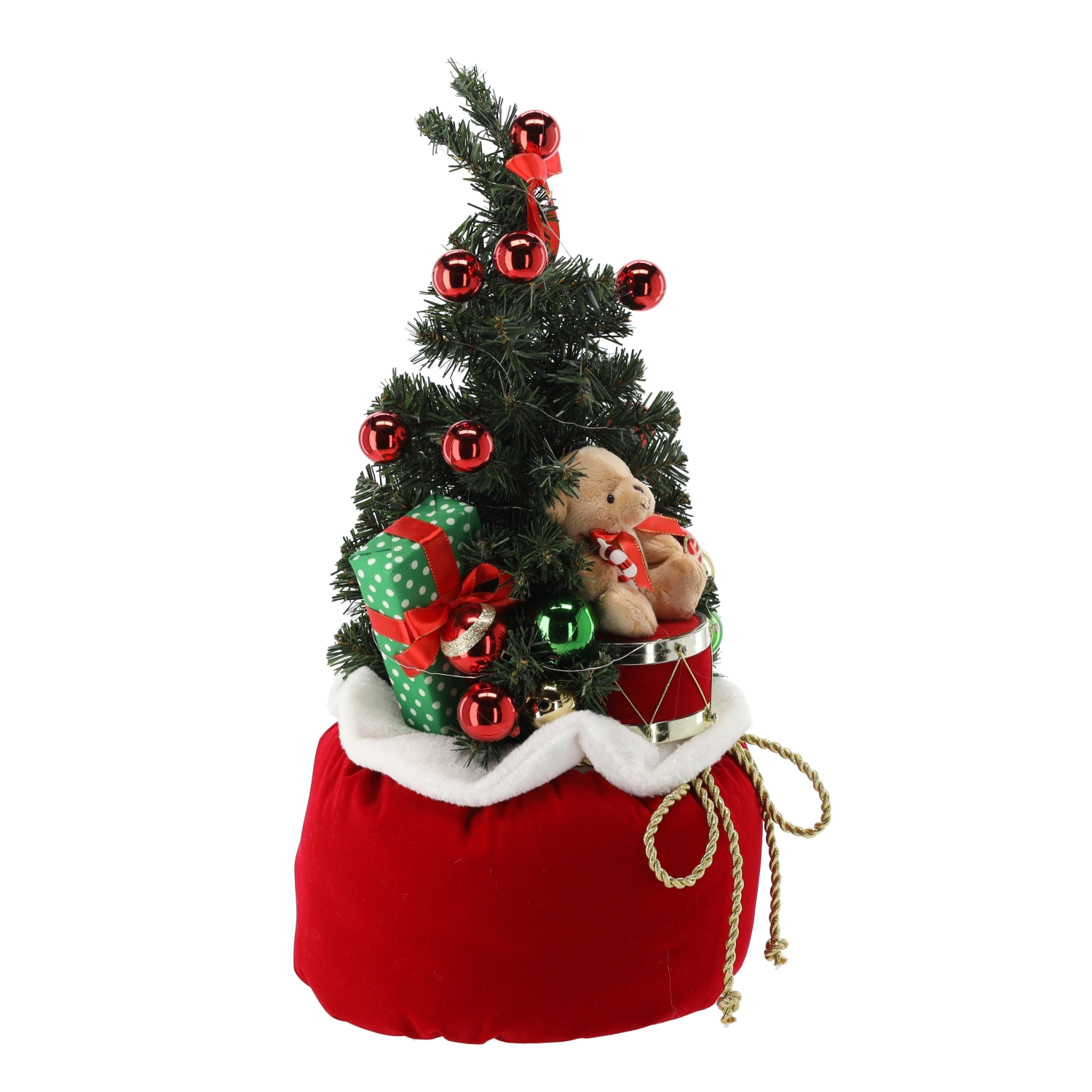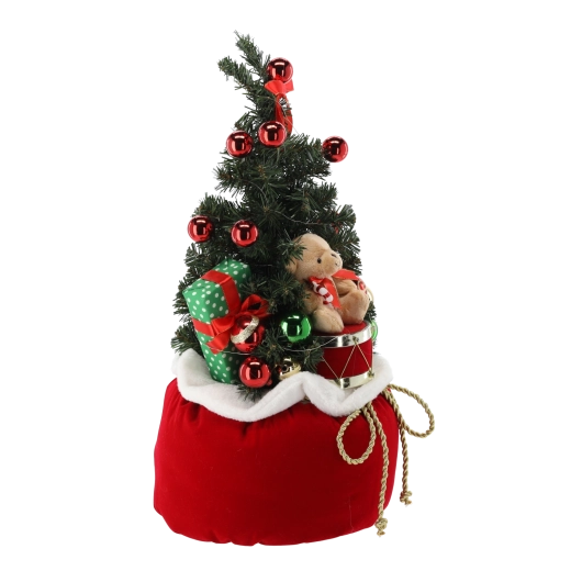 Un doux petit sac rouge avec bord blanc et cordon doré apporte une touche élégante et maintient le sapin fermement en place.