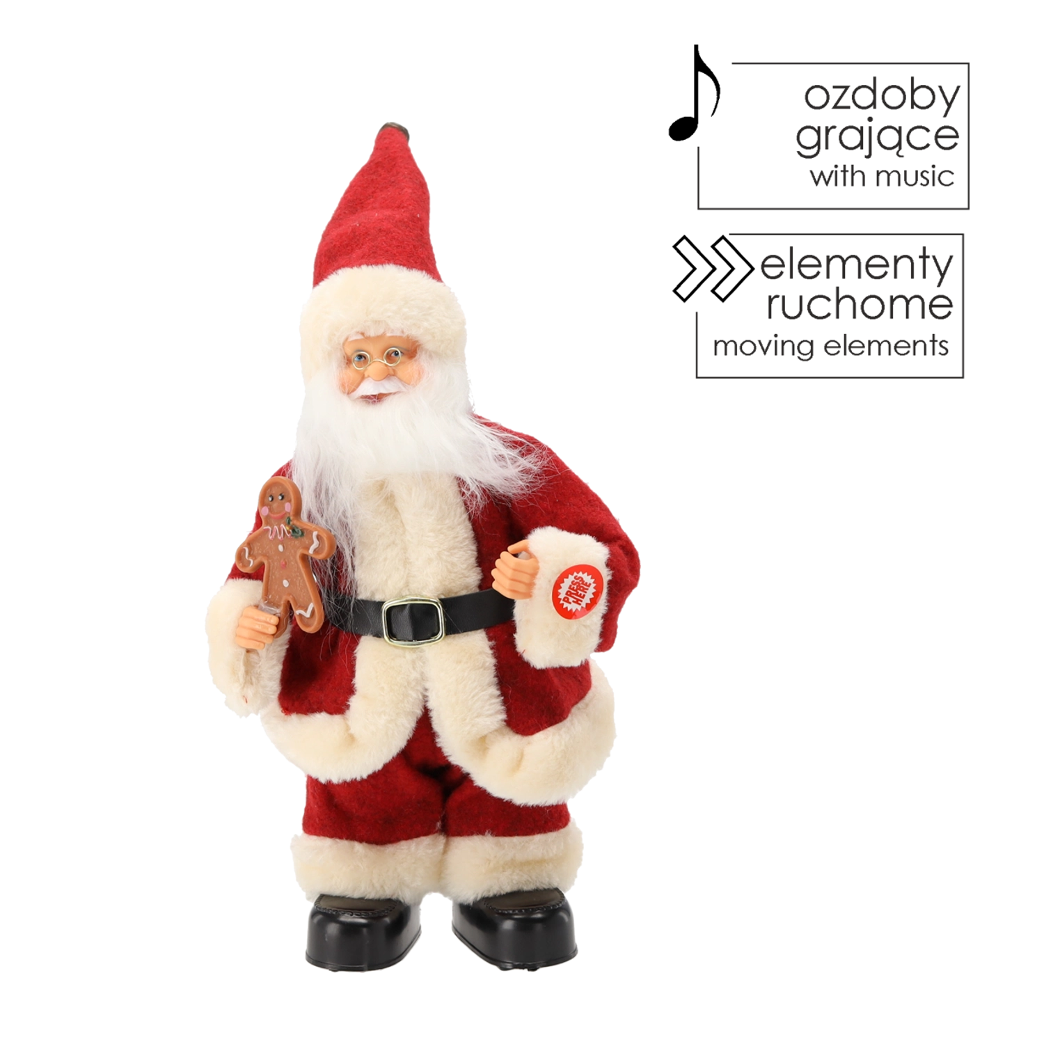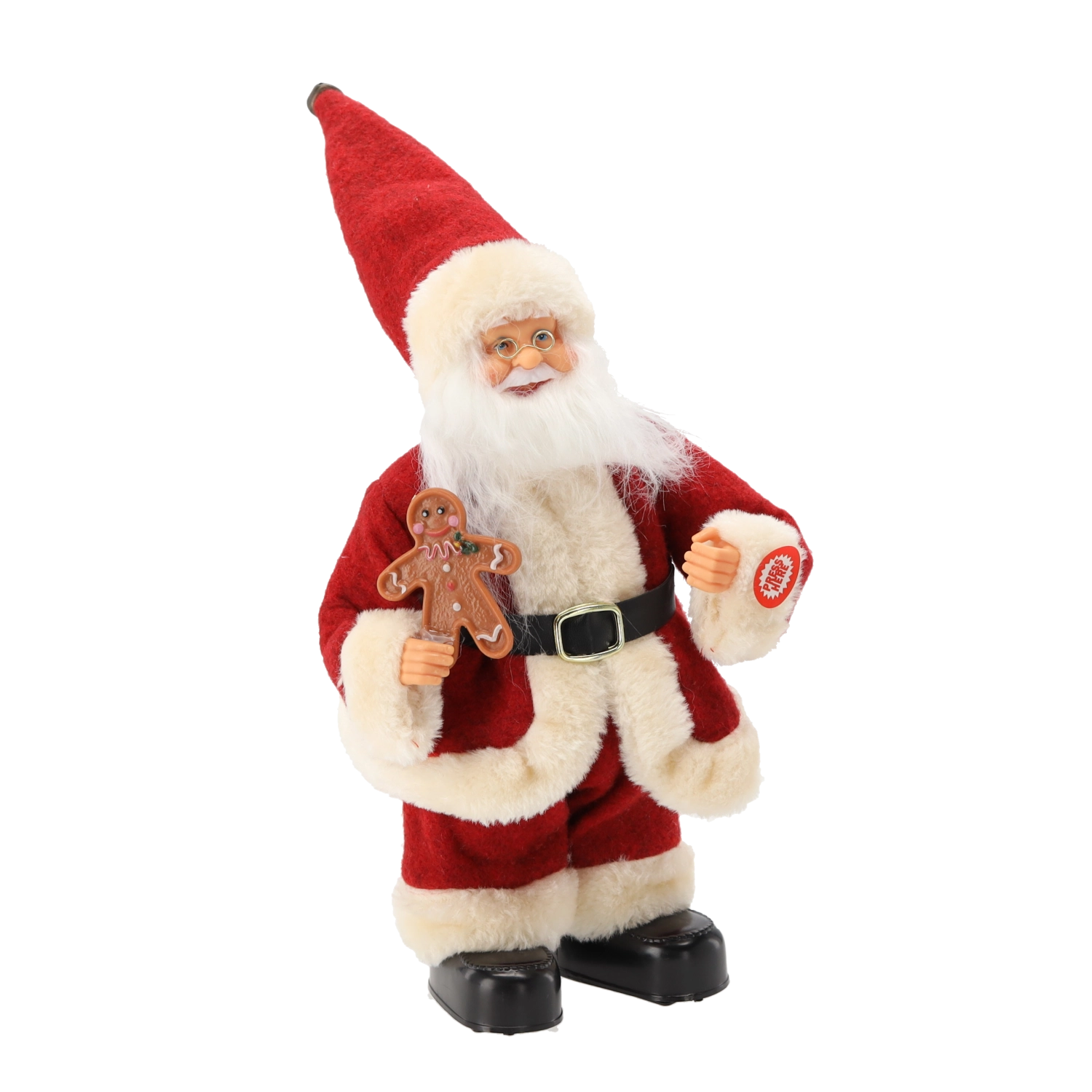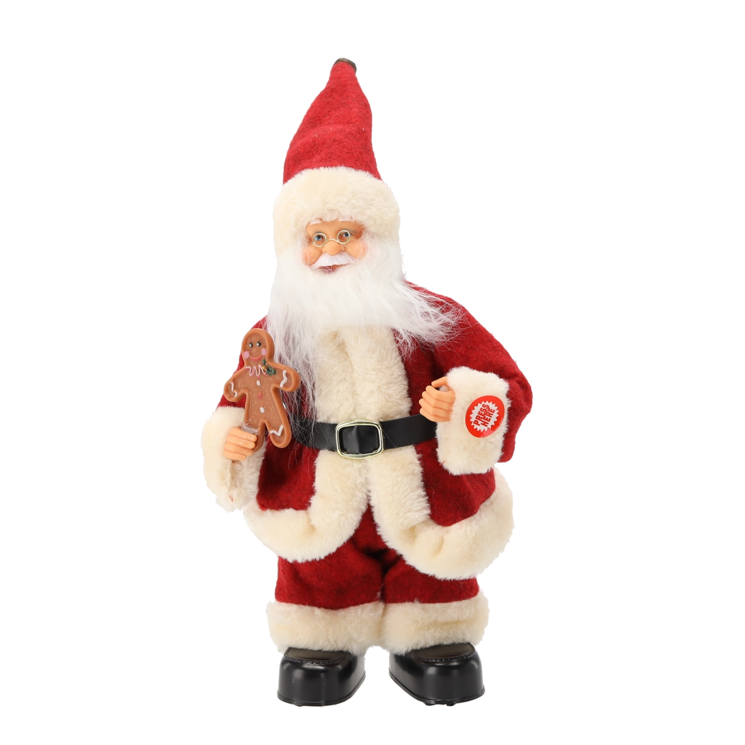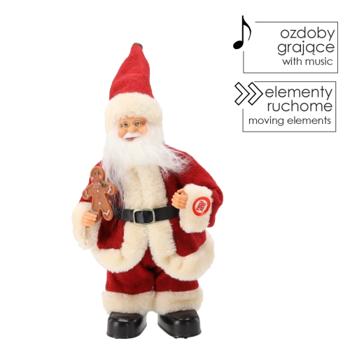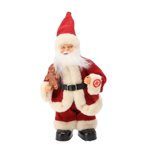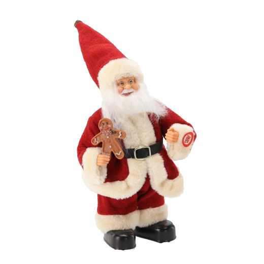 La figurine est soignée dans les moindres détails : longue barbe blanche, bordures en fausse fourrure douce, ceinture et bottes noires, bonhomme en pain d’épices à la main – tout contribue à un rendu authentique. Grâce à ses dimensions compactes de 30 cm, elle est parfaite sur une table, une commode, un comptoir d’accueil ou en vitrine de magasin.