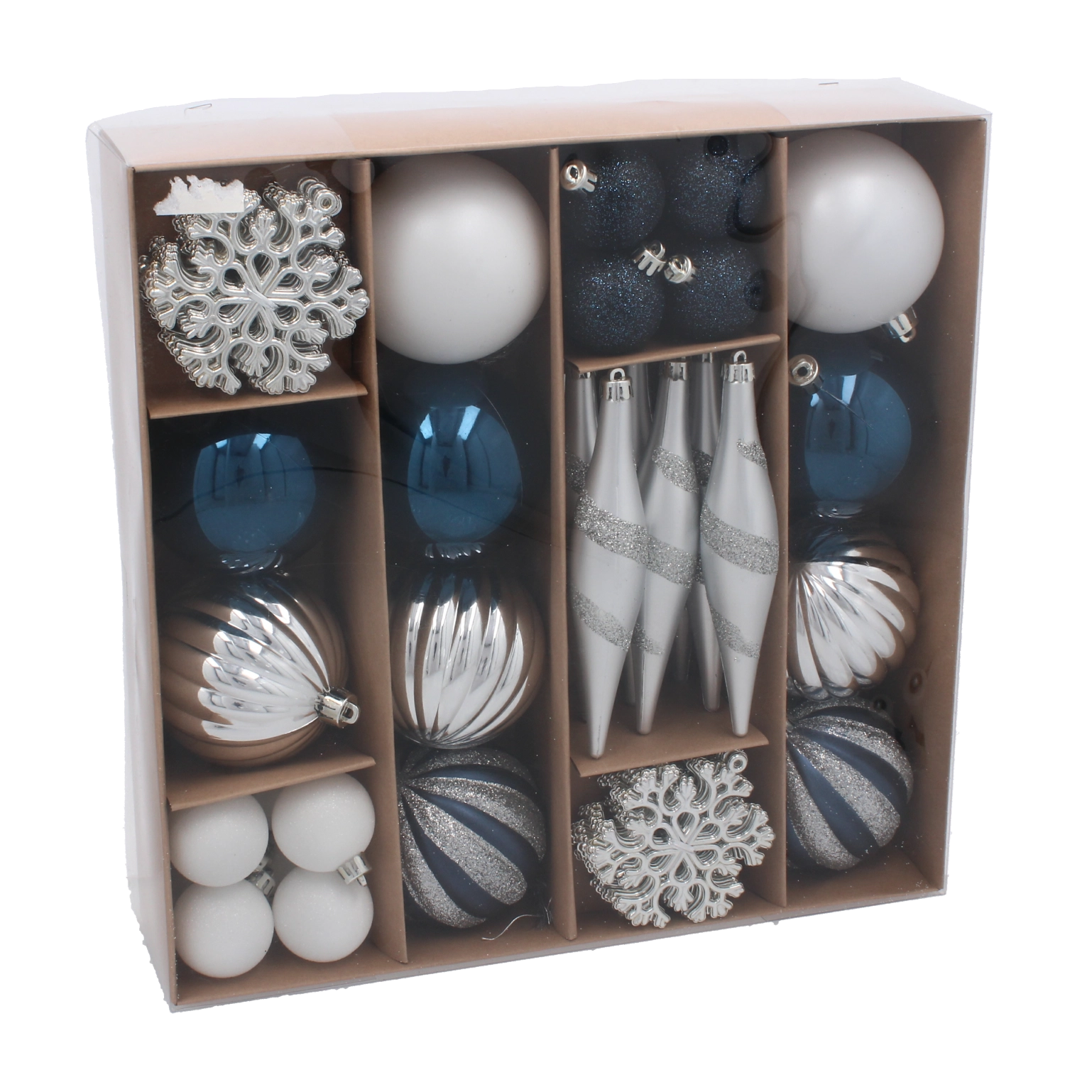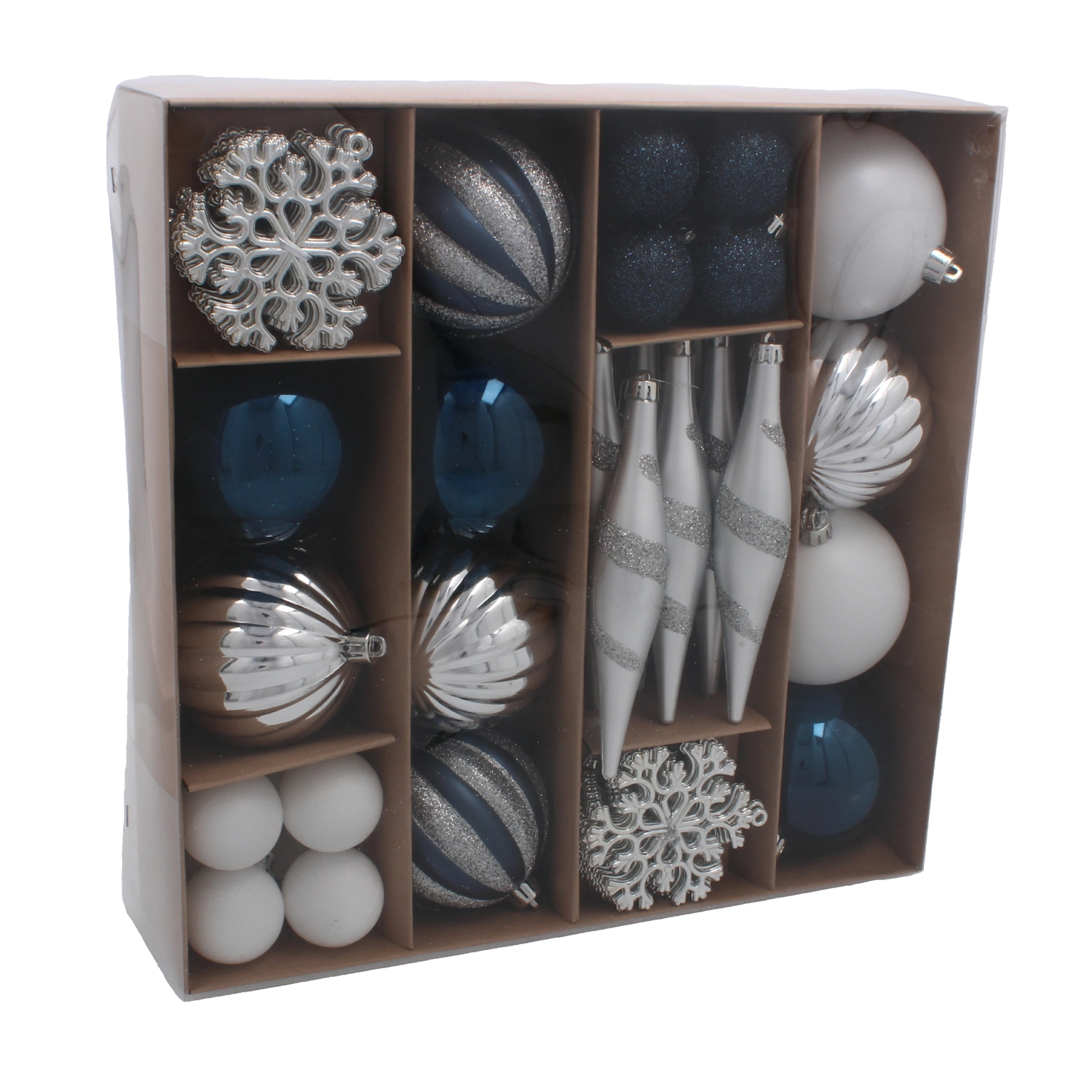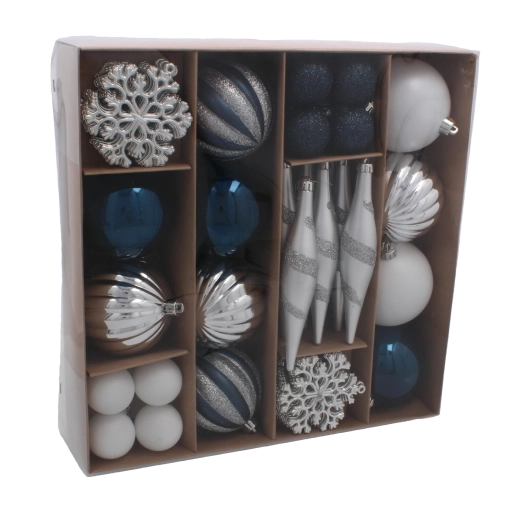 Un set élégant de 50 décorations de Noël dans des tons de bleu marine et d’argent apporte une touche moderne et harmonieuse à votre décoration de fête. Les ornements sont en plastique incassable, sûrs pour les foyers avec enfants et animaux, et grâce à leur légèreté, ils se suspendent facilement sur les petits comme sur les grands sapins. Les formes variées – des boules classiques aux pommes de pin – permettent de créer une décoration parfaitement coordonnée. Livré dans une boîte cadeau idéale aussi pour offrir.