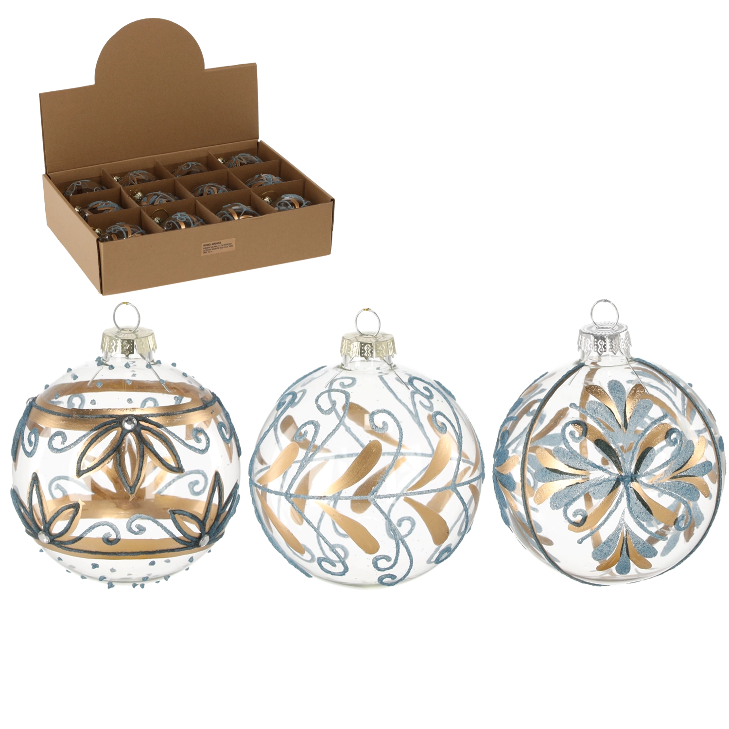 Élégantes boules de Noël en verre de 8 cm de diamètre, alliant bleu profond et détails dorés, pour conférer à votre sapin une touche de luxe. Leur surface brillante réfléchit magnifiquement la lumière et l’assortiment de motifs du coffret permet de créer une décoration harmonieuse et unique tout au long de l’Avent et le soir de Noël.