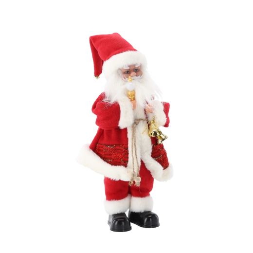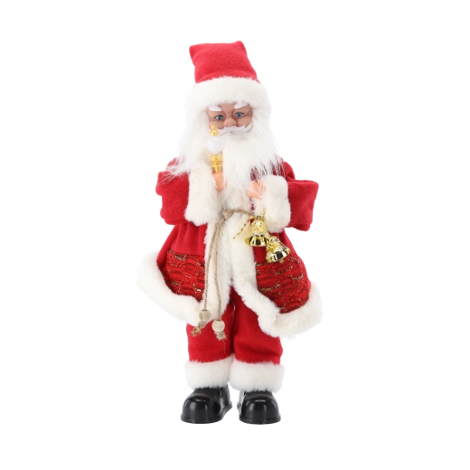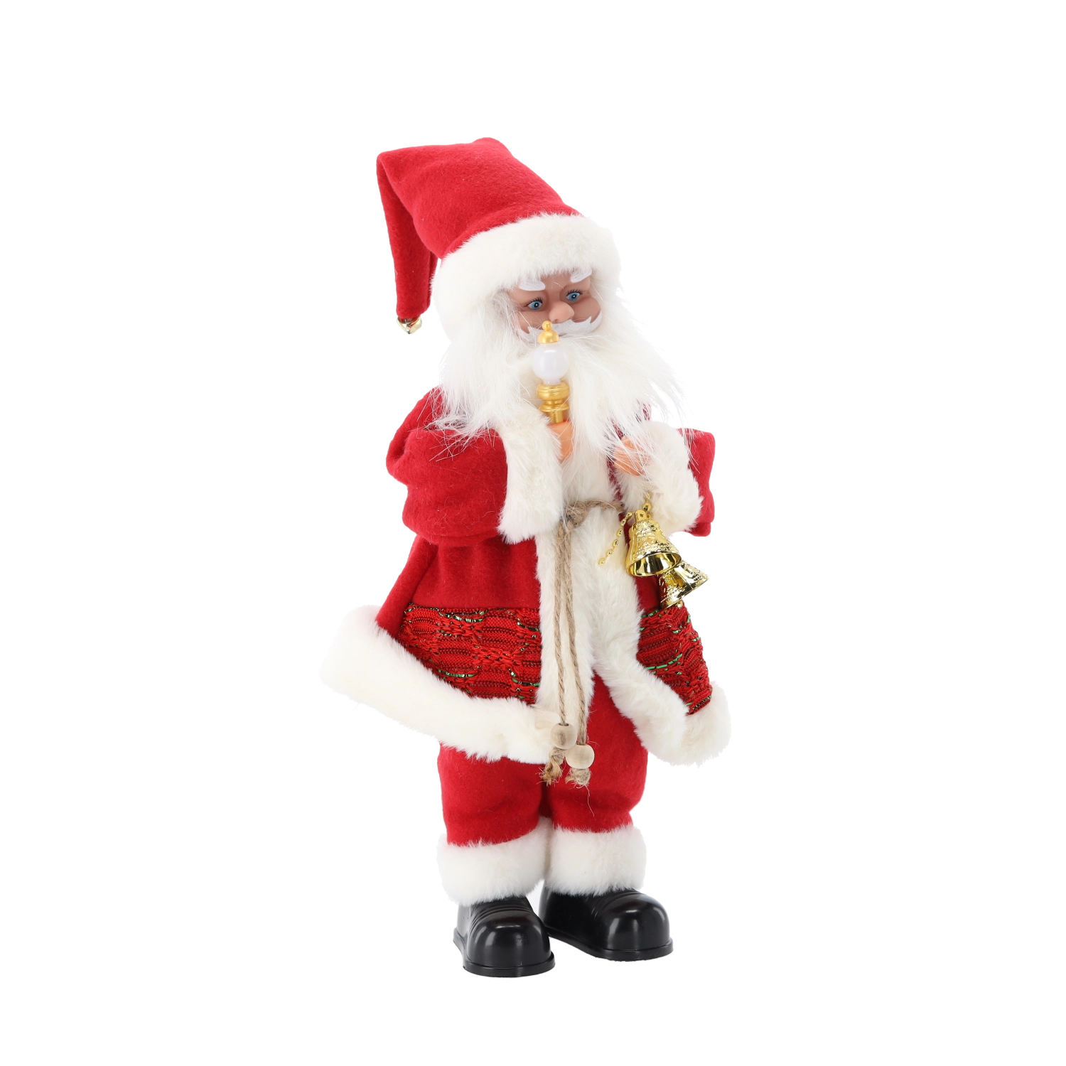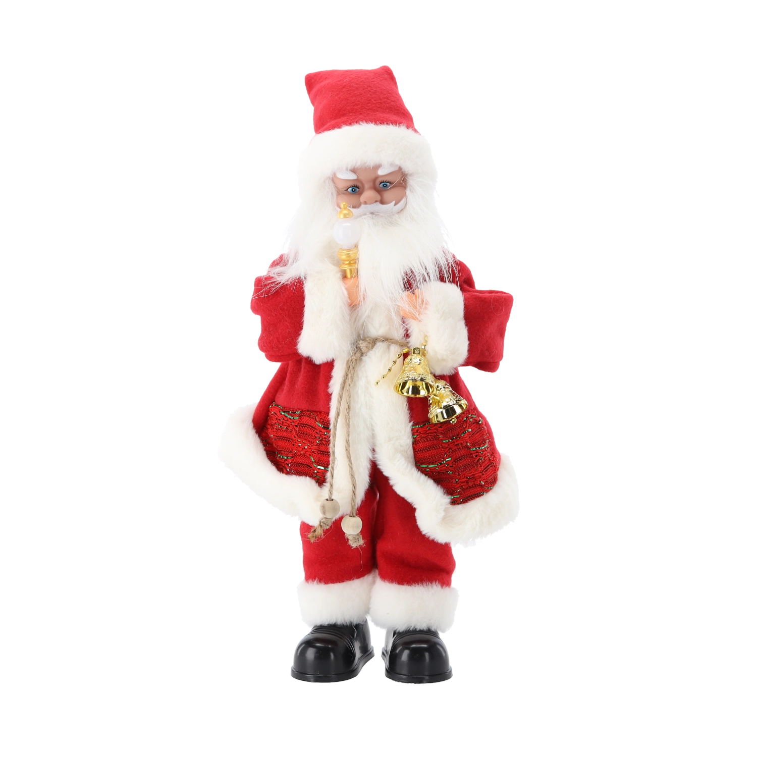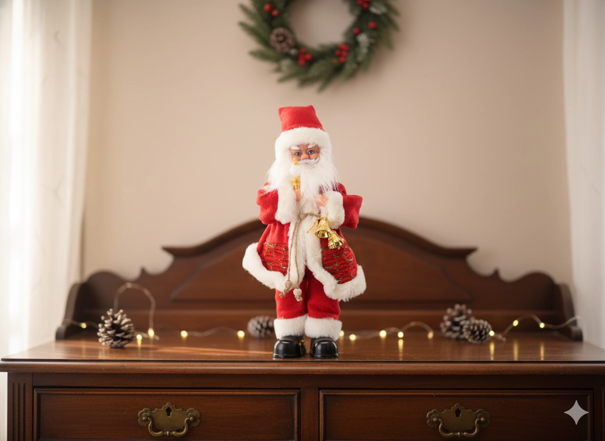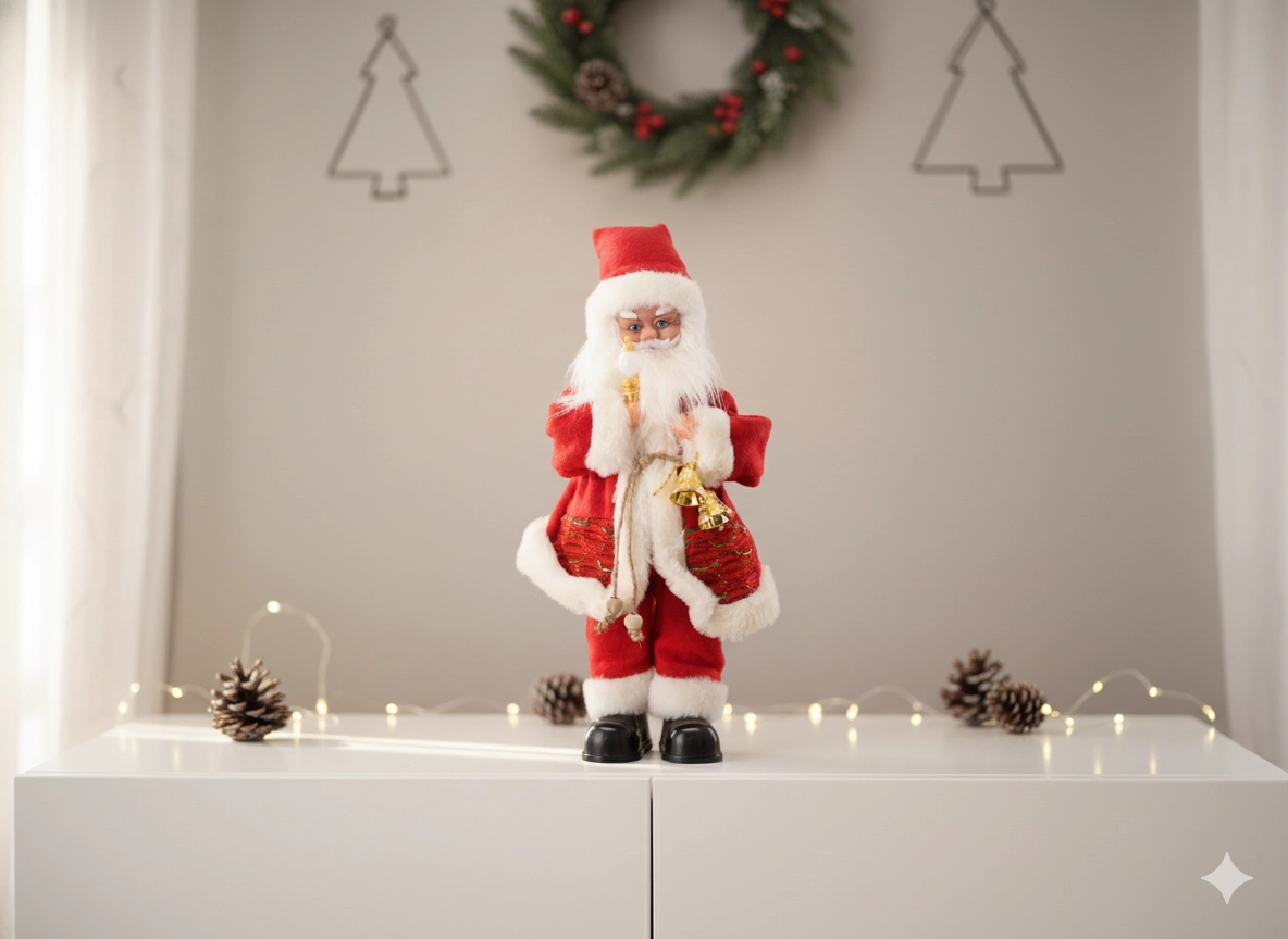 Barbe détaillée, costume à bordure blanche et accessoires. Tient fermement sur une surface plane – idéal sur une commode ou au pied du sapin.
