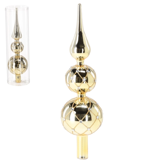 Apportez à votre sapin une touche de luxe étincelant et d’élégance festive avec un sommet en verre de 30 cm. Grâce à sa forme allongée classique, à sa finition dorée et à sa maille scintillante ornée de cristaux, il reflète magnifiquement la lumière. Un fixation standard garantit une installation facile et sûre au sommet du sapin.
