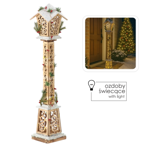 Cette grande lanterne en bois, dans une teinte marron, diffuse grâce à ses LED intégrées une lumière chaude et agréable qui traverse joliment les découpes décoratives. Les brindilles, les baies et les détails enneigés réalistes soulignent son style hivernal et festif, parfait près de la porte, sur la véranda, dans le séjour ou à côté du sapin.
