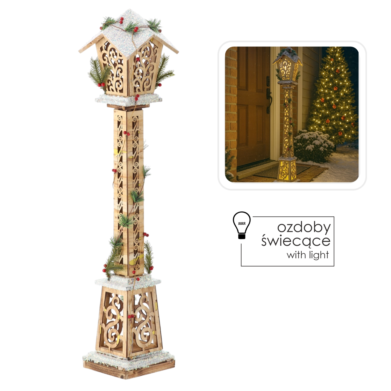 Une lanterne de Noël élégante en bois naturel avec un éclairage LED chaud apporte à votre maison et à votre entrée une atmosphère festive magique. Grâce à ses découpes ornementales, à ses accents hivernaux avec neige, verdure et baies et à sa hauteur imposante de 100 cm, elle crée une ambiance élégante et chaleureuse à l’intérieur comme sur une terrasse couverte.