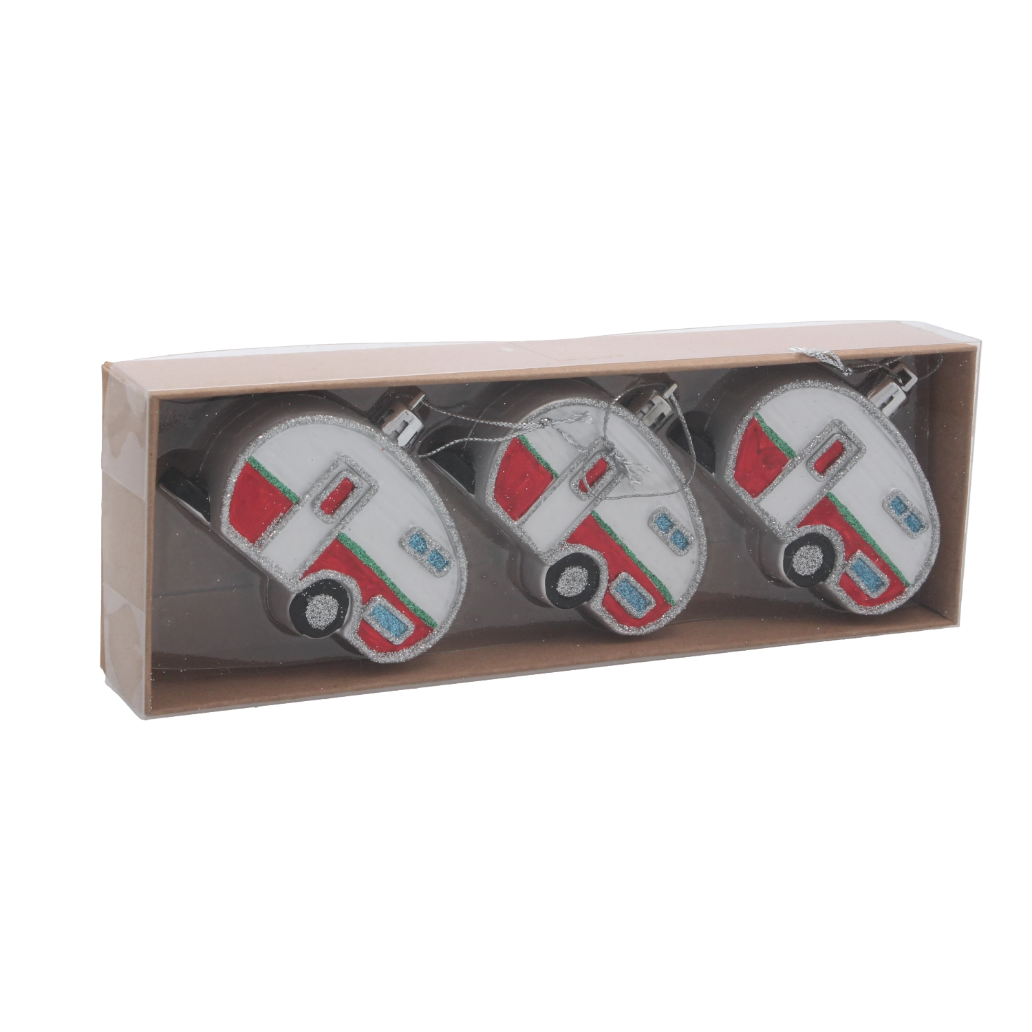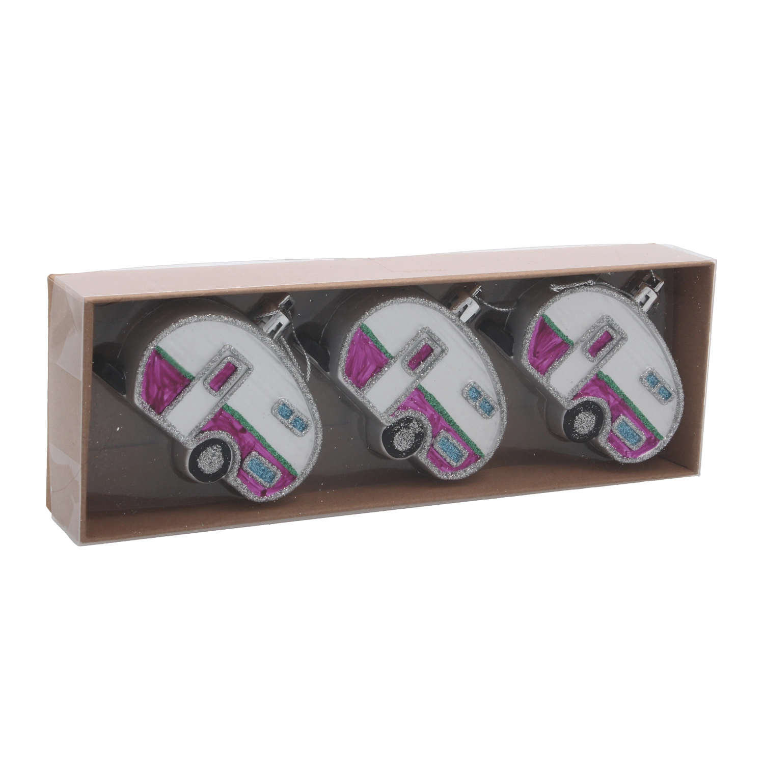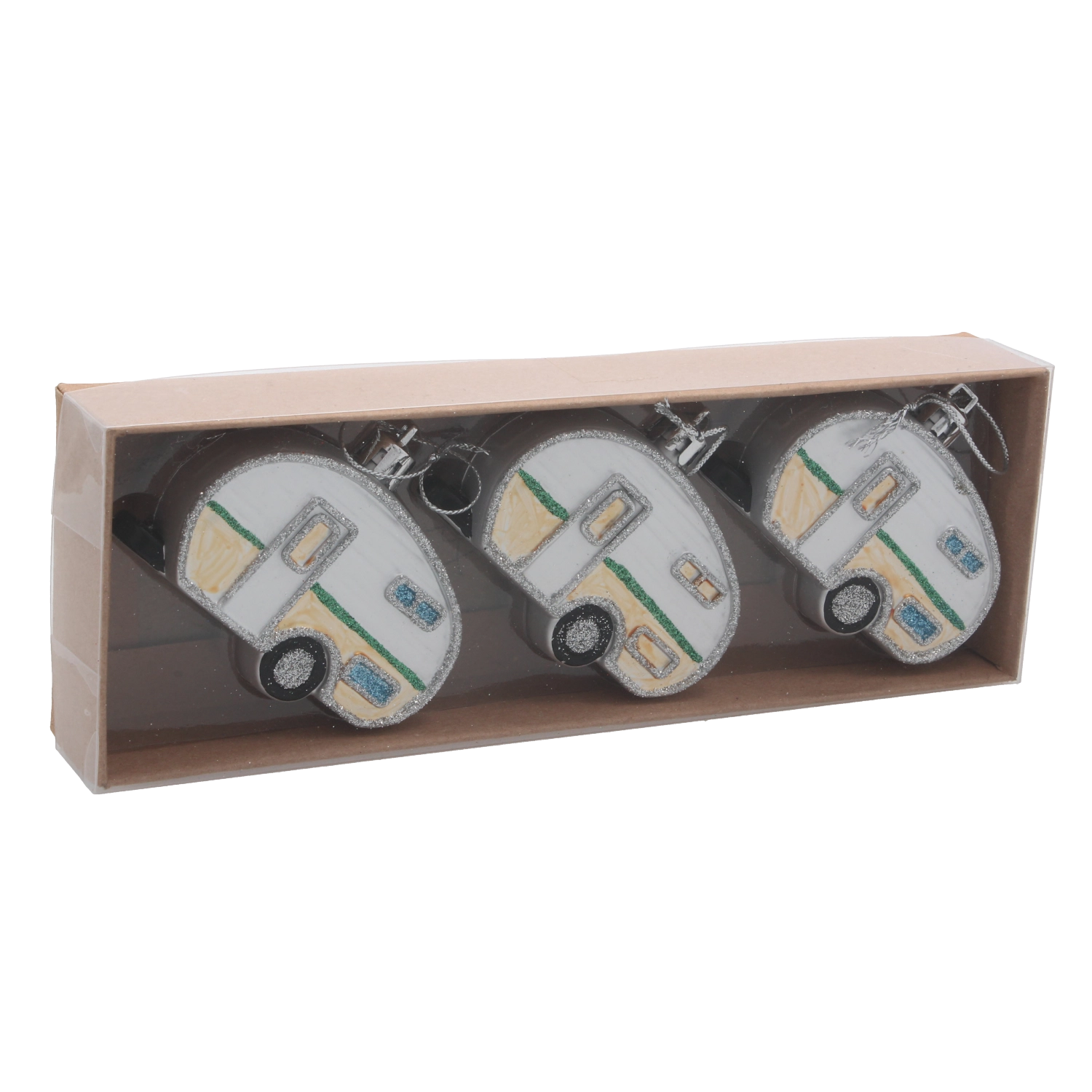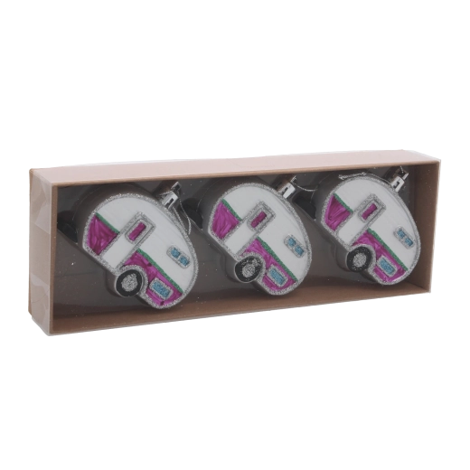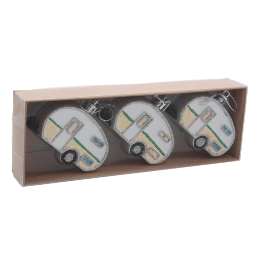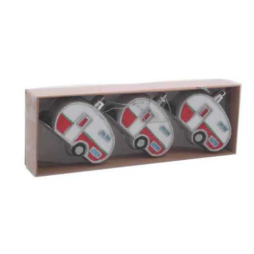 Avec ce set original, vous donnerez à votre sapin une touche rétro ludique. Les trois caravanes, dans un mélange de couleurs, se distinguent par des détails réalistes et un léger éclat qui reflète joliment la lumière des bougies comme celle des guirlandes LED. Grâce à leur faible poids, vous pouvez les suspendre partout sans alourdir inutilement les branches.