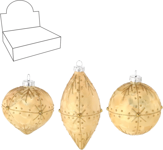 Élégantes boules de Noël en verre dans une luxueuse teinte dorée qui apporteront un véritable éclat à votre sapin. Le set combine un mélange de formes pour un effet saisissant : boules rondes de 8 cm de diamètre et décorations allongées de 6 × 13 cm. Les détails décorés à la main et le design doré classique soulignent l’atmosphère festive et s’harmonisent facilement avec le reste de votre décoration.