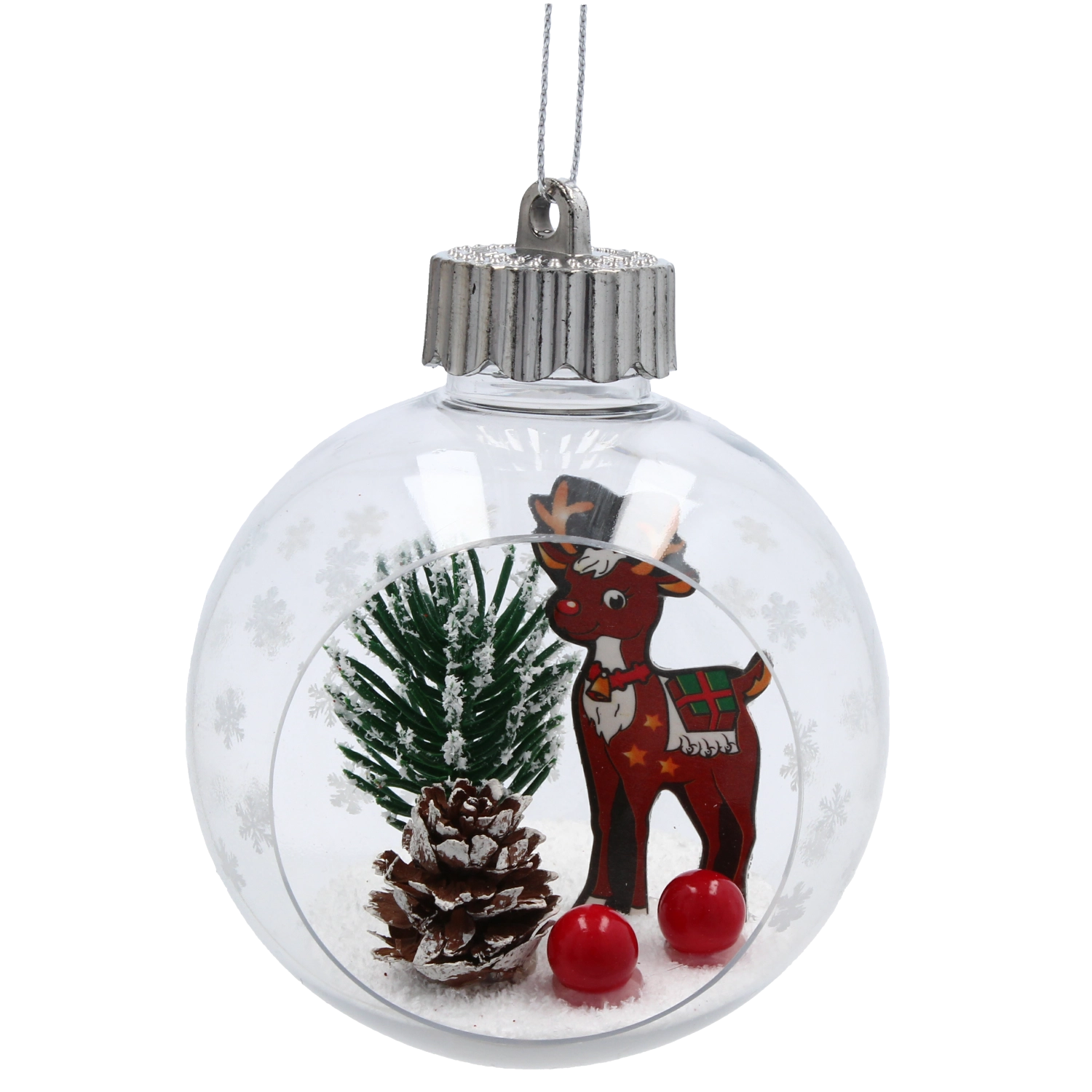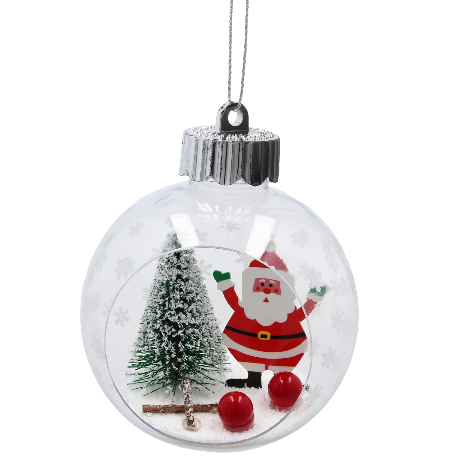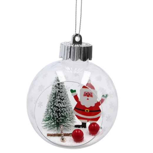 Cette décoration de Noël en forme de boule transparente avec attache argentée abrite une petite scène hivernale : un sapin légèrement enneigé, une pomme de pin, des baies rouges et un personnage selon le motif choisi. L’association du verre et d’un plastique léger garantit une faible masse, une fixation sûre et une longue durée de vie. Chaque pièce est soigneusement fabriquée avec le sens du détail pour créer une ambiance festive authentique.