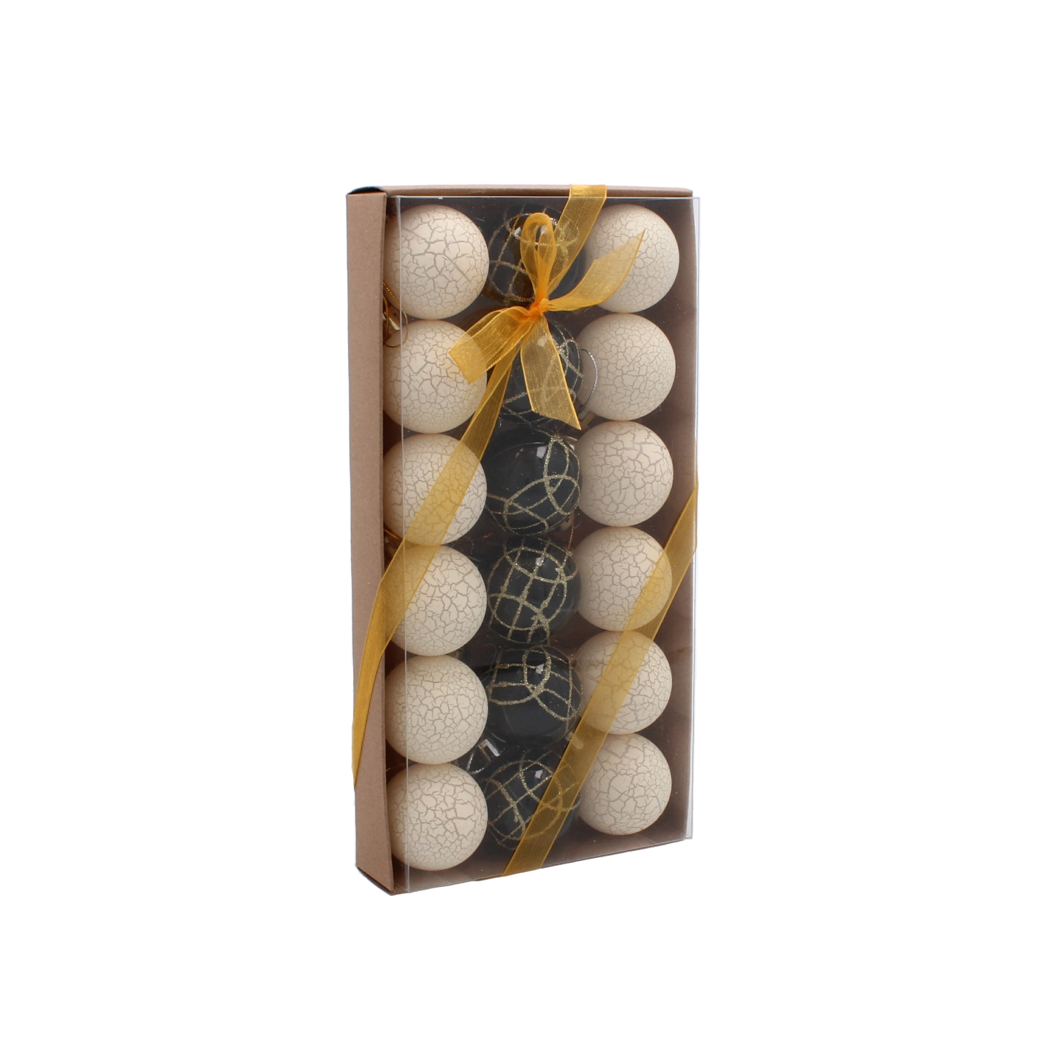 Élégant set de 18 boules de Noël en verre de 4 cm de diamètre qui apporte à votre sapin du style et une harmonie visuelle. La combinaison de finitions brillantes et mates crée un contraste saisissant qui se marie à merveille avec d’autres décorations. Grâce à leurs dimensions compactes, elles conviennent aux petits comme aux grands sapins, et leur forme ronde intemporelle s’adapte à différents styles de décoration.