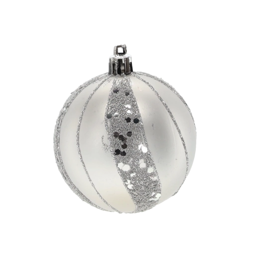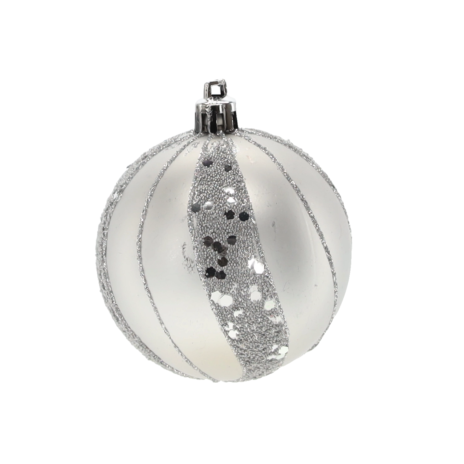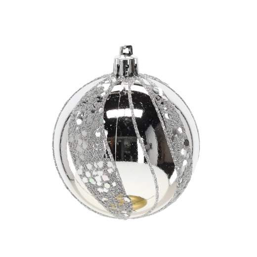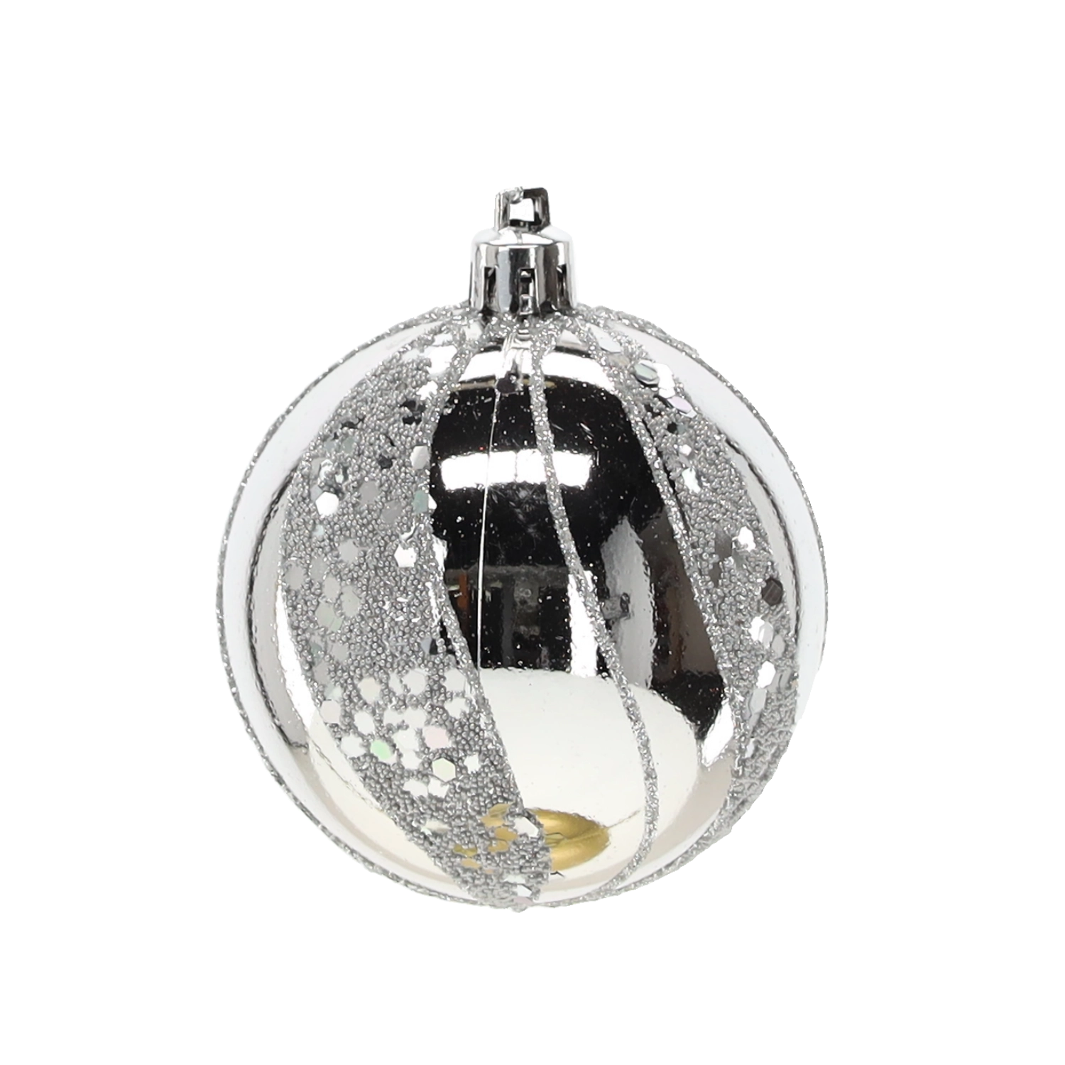 Un élégant set de six boules de Noël argentées de 7 cm de diamètre apporte éclat et élégance à votre décoration. La combinaison de finitions mates et brillantes avec des détails pailletés crée une atmosphère festive féerique. Le plastique léger et résistant est sûr pour les enfants et idéal pour une suspension facile sur le sapin, les couronnes, les guirlandes et dans les compositions de table.