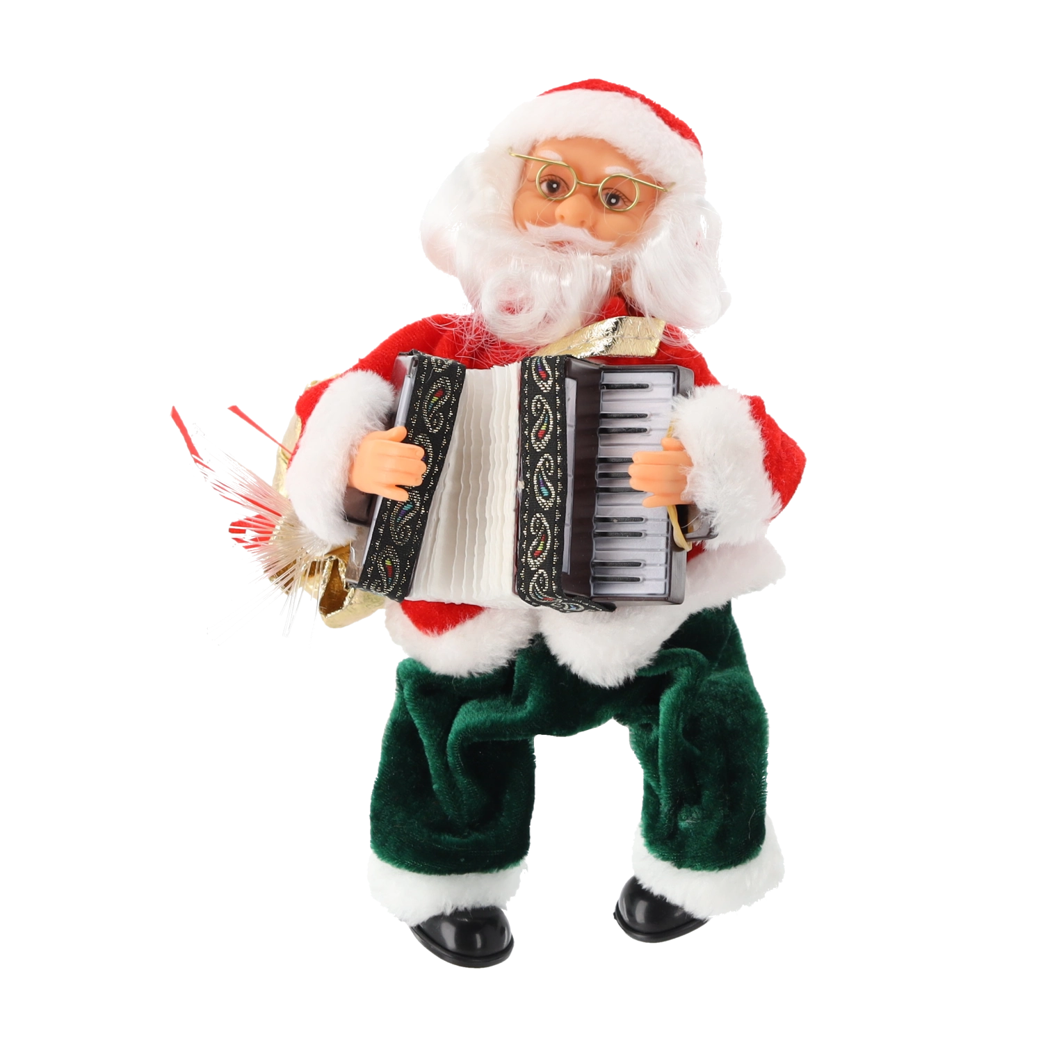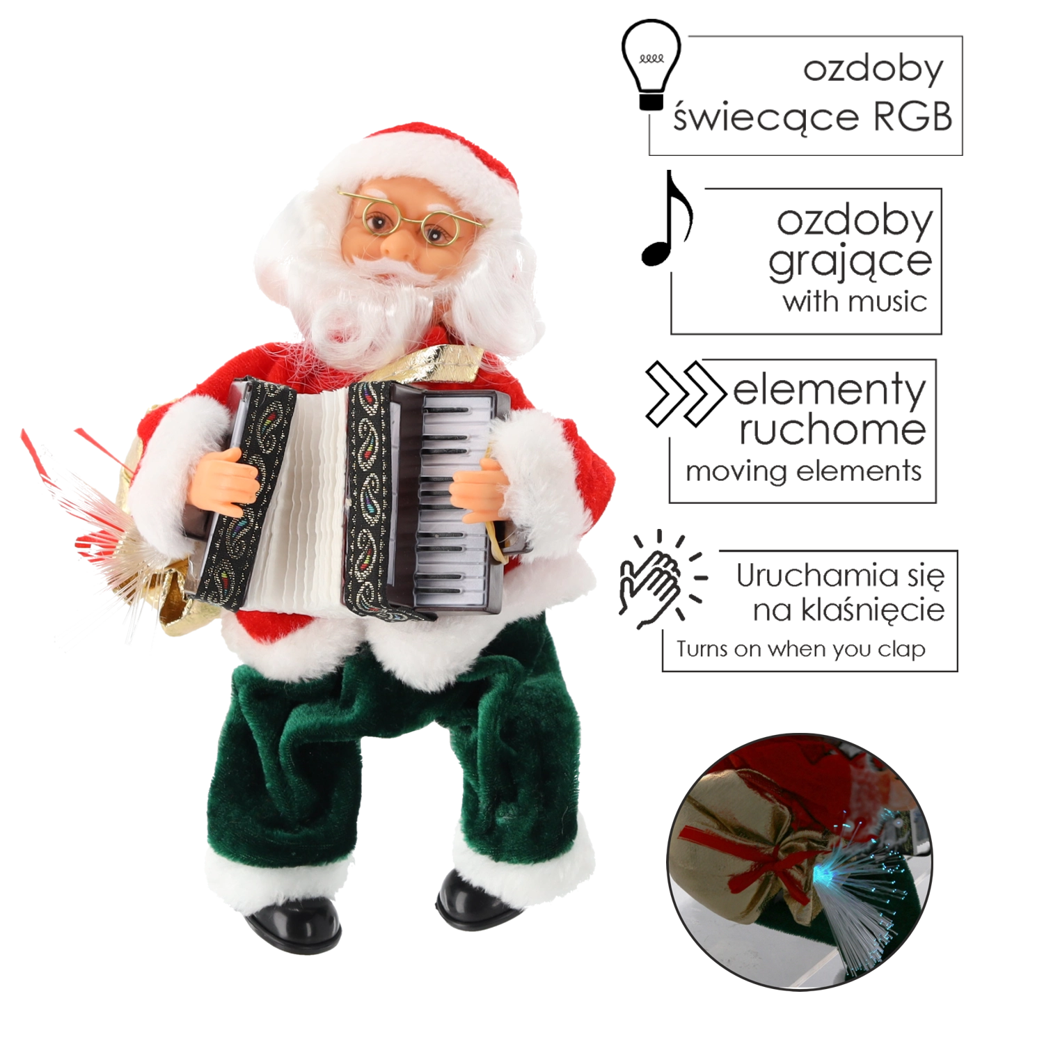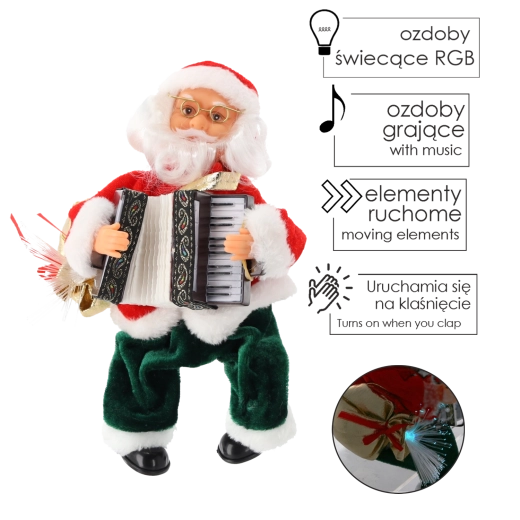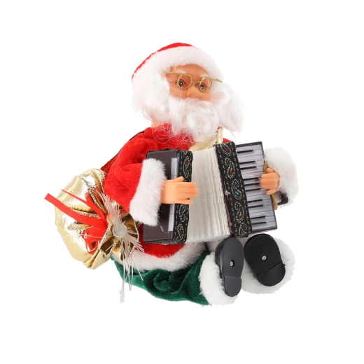 Charmante figurine de NOËL représentant le PÈRE NOËL en manteau rouge traditionnel et pantalon vert, elle transforme tout intérieur en scène festive. Le Père Noël joue de la musique, fait bouger l’accordéon et son sac à LED brille doucement, créant ainsi une atmosphère chaleureuse à la maison comme au bureau.
