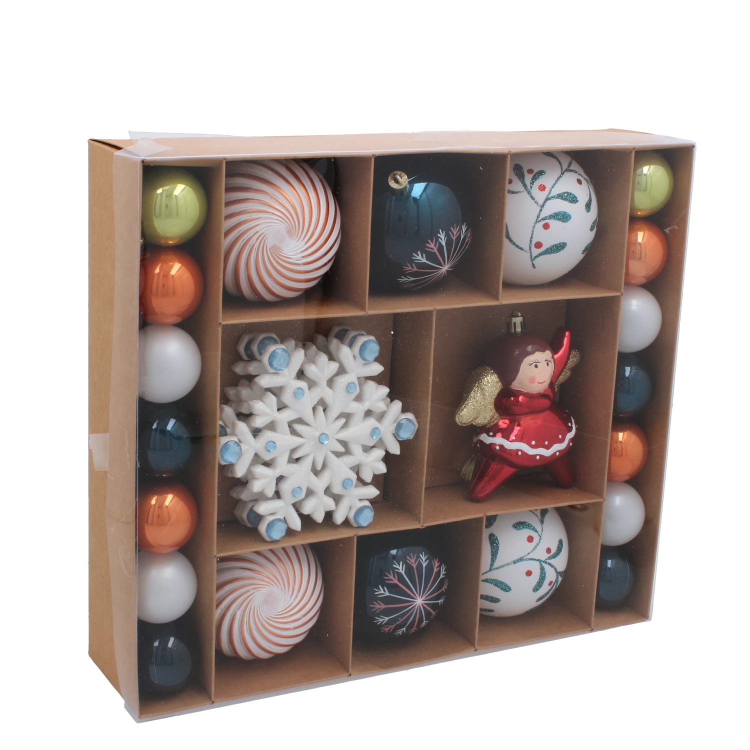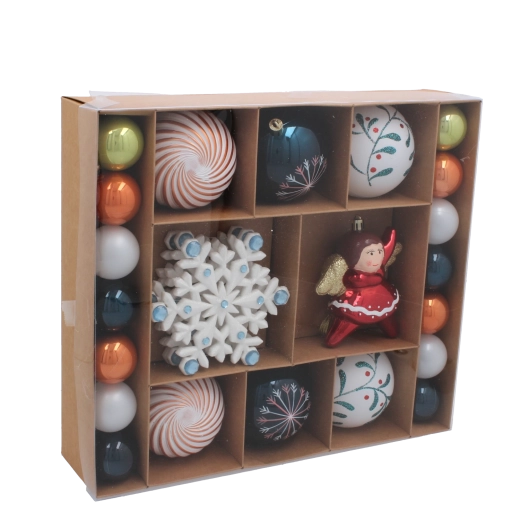 Ce set polyvalent propose une combinaison harmonieuse de boules brillantes, de flocons et de décorations figuratives, vous permettant d’harmoniser facilement votre décoration avec un style moderne comme traditionnel. Chaque pièce est conçue pour une suspension rapide et sûre, pour que la décoration soit un plaisir pour toute la famille.