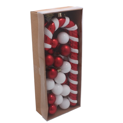 Apportez la magie de Noël chez vous avec un set élégant de 32 décorations combinant une canne en sucre de 25 cm et un assortiment de boules de 3 cm de diamètre dans des couleurs traditionnelles. Grâce au plastique incassable, les décorations sont légères, sûres et durables, tandis que les finitions variées et la pose facile à l’aide de ficelles garantissent une décoration du sapin rapide et élégante.