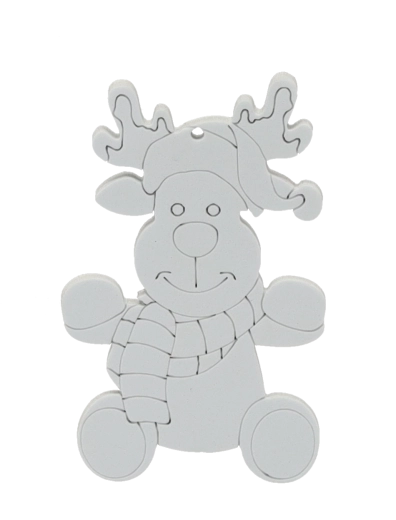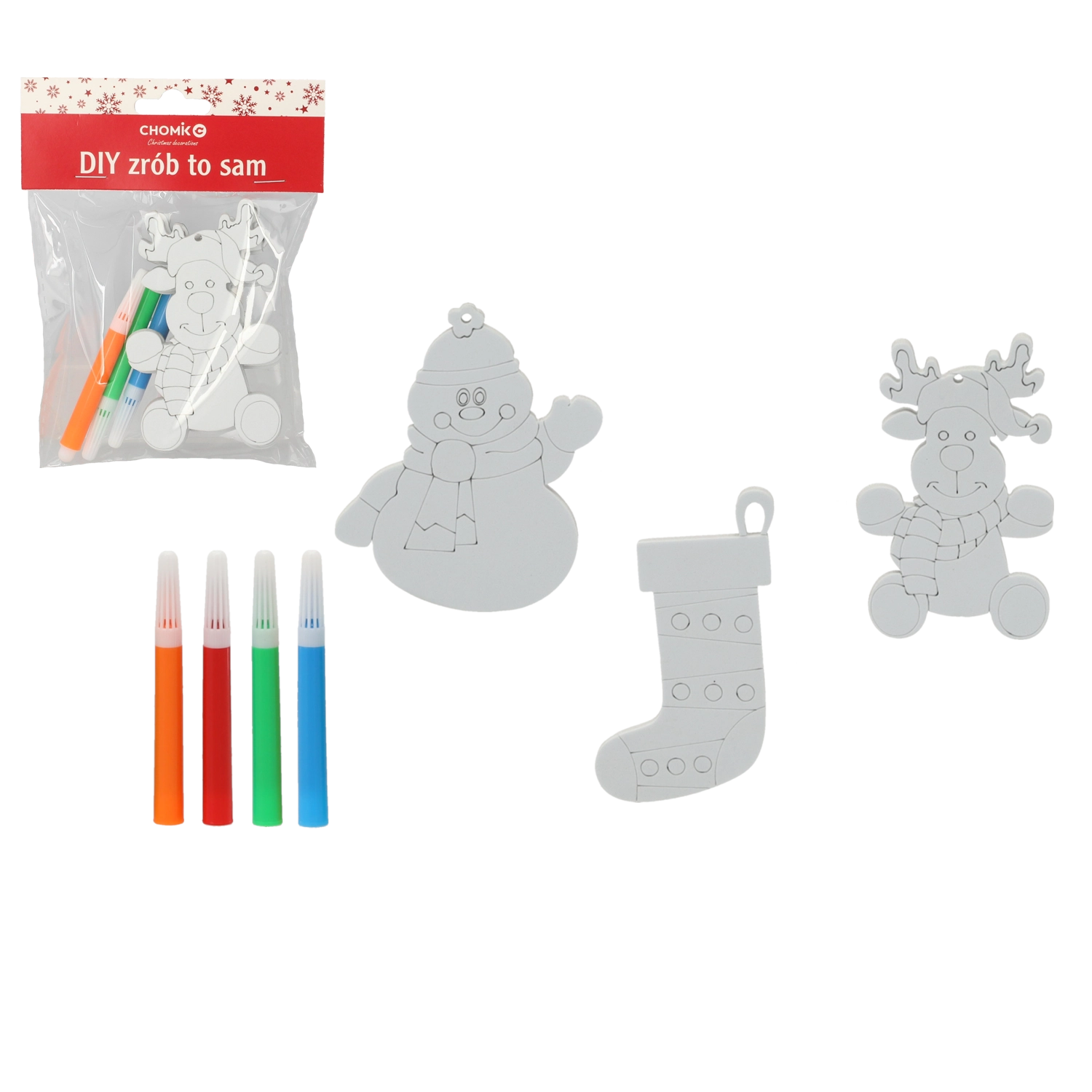 - 3 décorations à suspendre (bonhomme de neige, renne, chaussette) + 4 feutres colorés