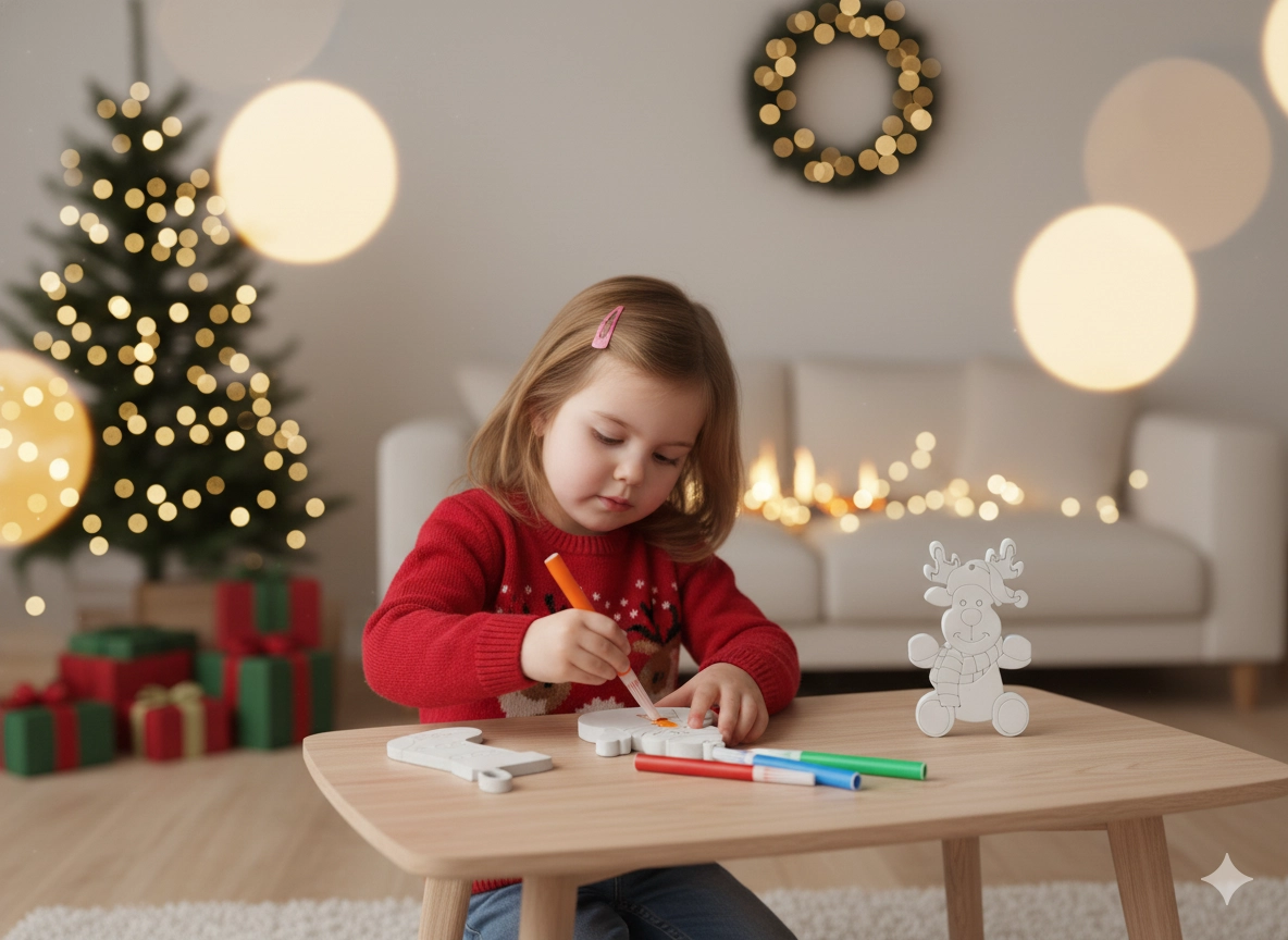 Créez votre propre magie de Noël ! Ce kit créatif contient 3 décorations à suspendre à colorier – un bonhomme de neige, un renne et une chaussette – ainsi que 4 feutres colorés. Le matériau léger est idéal pour les enfants, se décore facilement et les décorations finies se suspendent simplement au sapin, à la fenêtre ou sur un cadeau. Une activité amusante pour toute la famille et une décoration de Noël DIY magnifique.