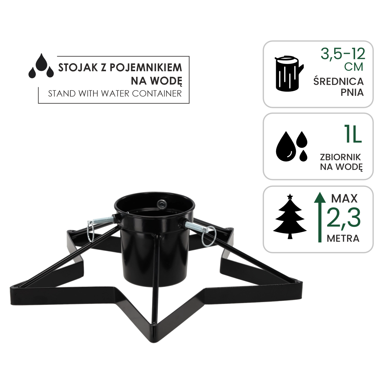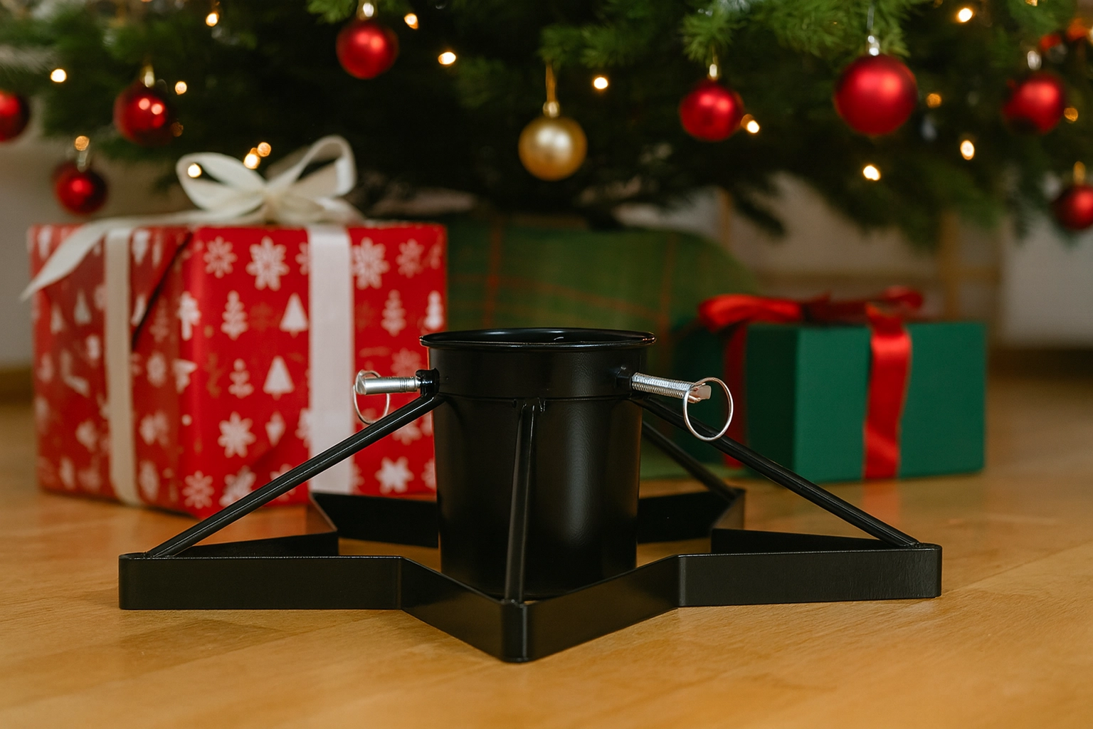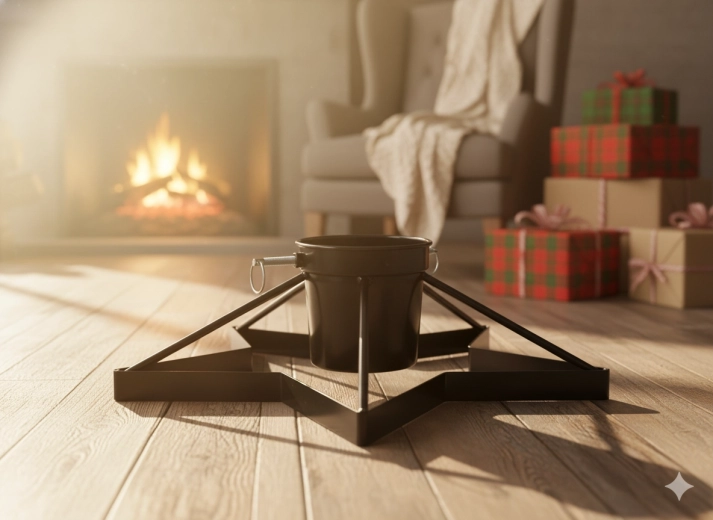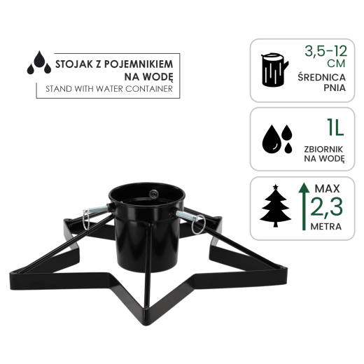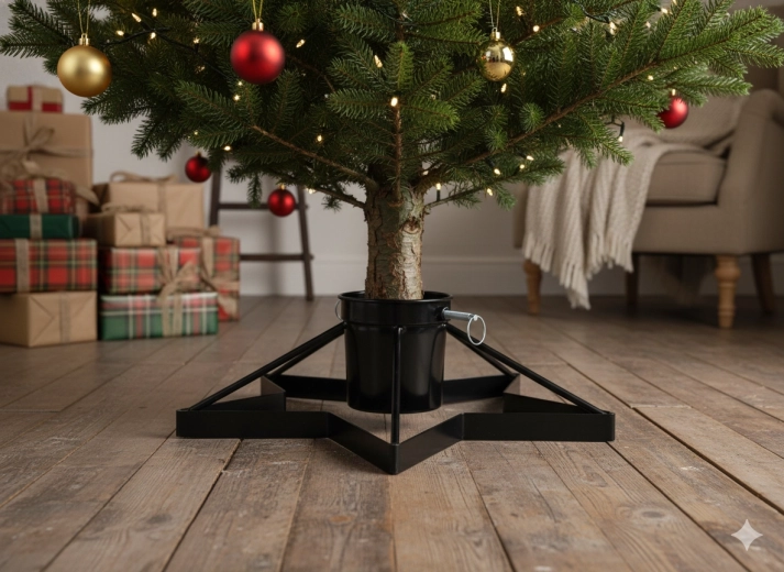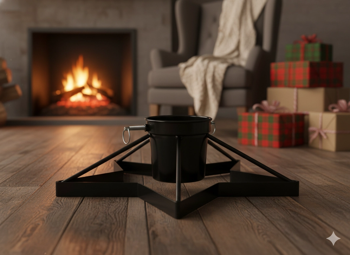 Élégant et stable, ce support métallique pour sapin de Noël avec réservoir d’eau intégré garde votre sapin frais plus longtemps et solidement en place. Grâce à sa structure métallique robuste, sa large base en étoile et ses trois vis de serrage, le montage est facile et le sapin reste parfaitement droit sans vaciller. La finition noire s’intègre à tous les intérieurs, du classique au loft moderne.