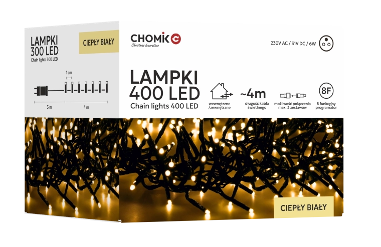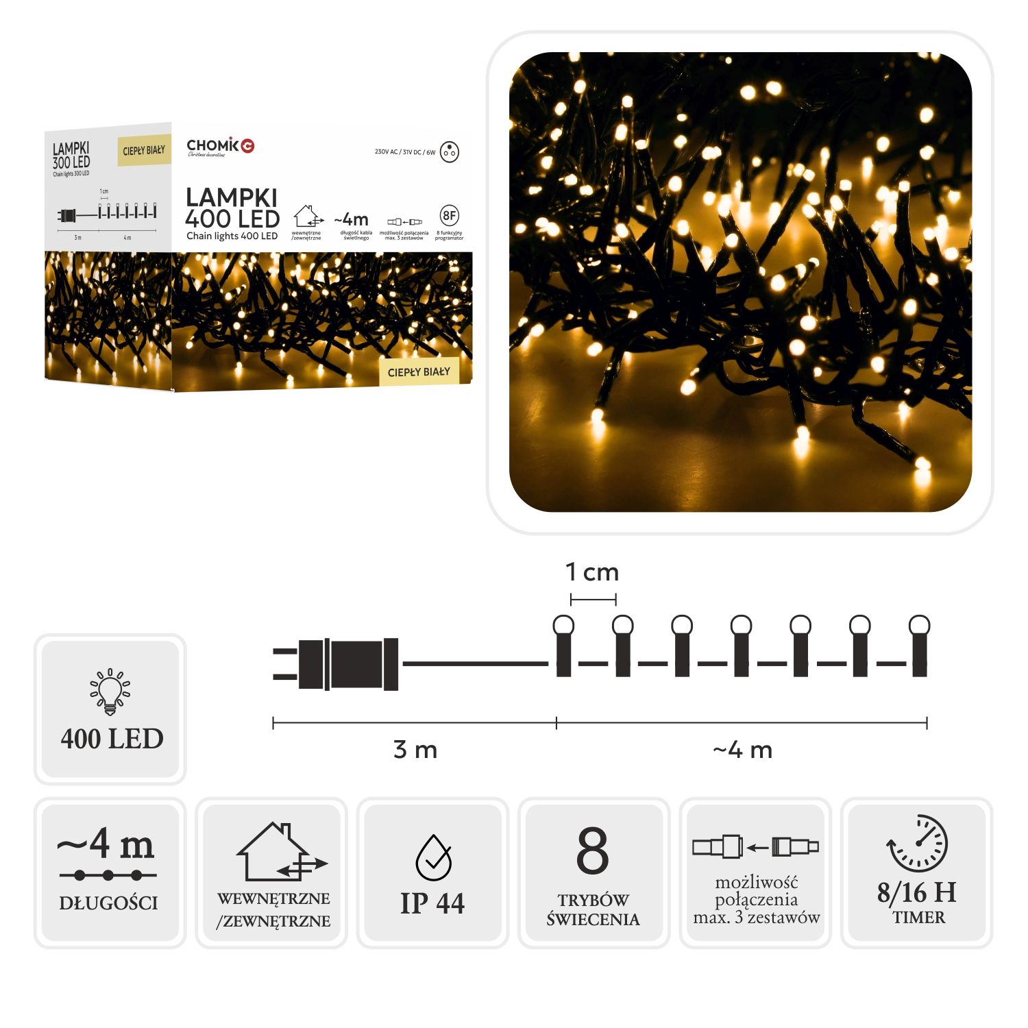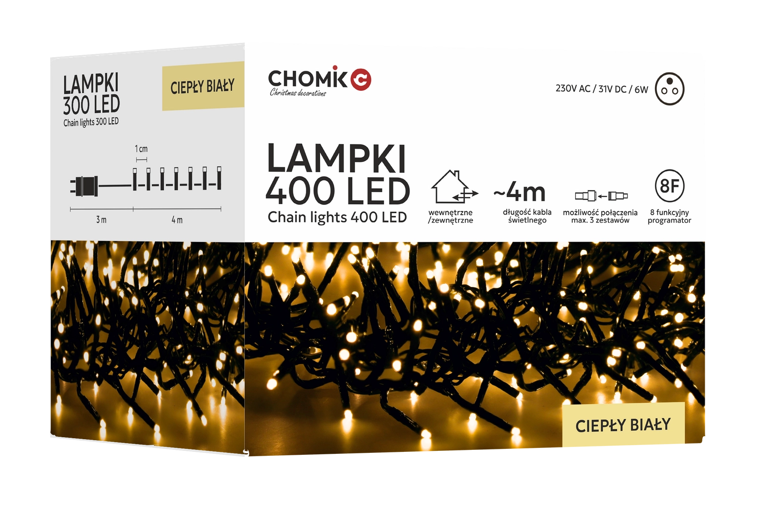 La guirlande LED Cluster avec 400 diodes apporte une lumière spectaculaire et dense, idéale sur le sapin de Noël, une rampe, un mur ou au jardin. La teinte blanc chaud crée une ambiance chaleureuse et, grâce au contrôleur avec mémoire et minuteur, vous réglez facilement votre mode préféré sans reprogrammation.