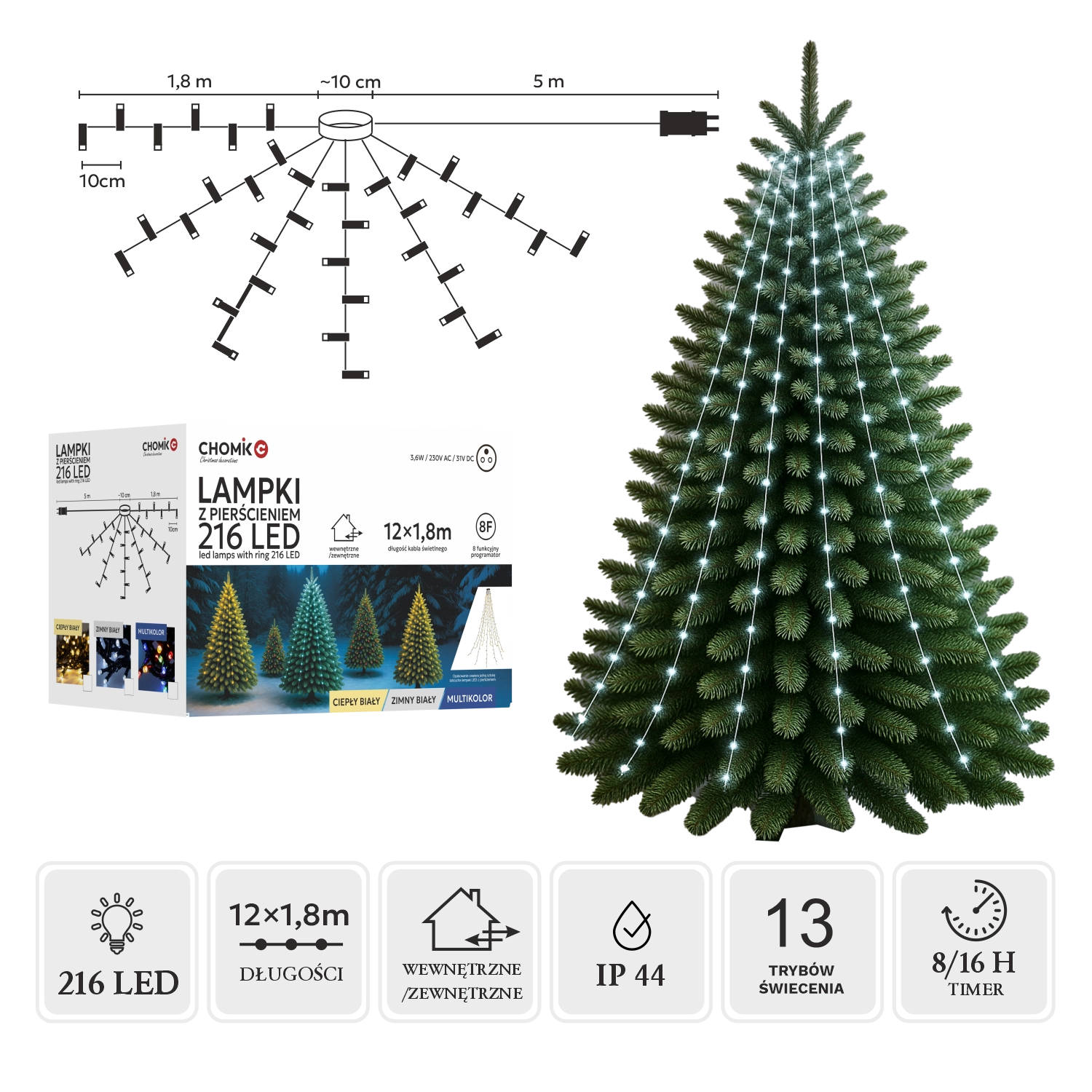 Le contrôle est simple grâce à 8 modes lumineux, à la fonction mémoire et au minuteur 8/16 h. L’alimentation sûre de 31 V et la protection IP44 garantissent un fonctionnement fiable en intérieur comme en extérieur. Le câble vert s’accorde naturellement avec le feuillage des sapins et les décorations.