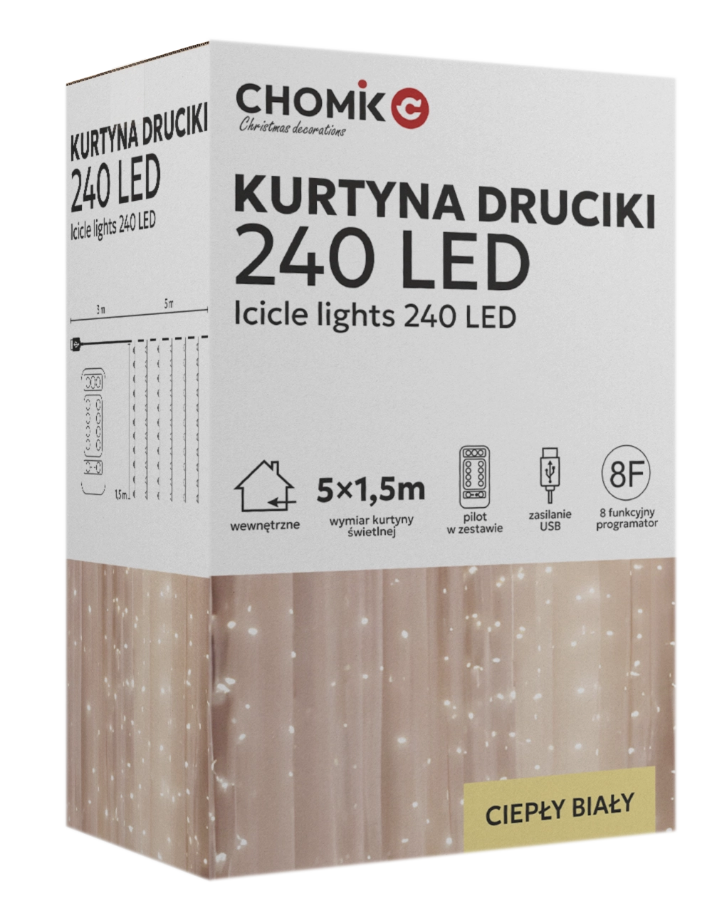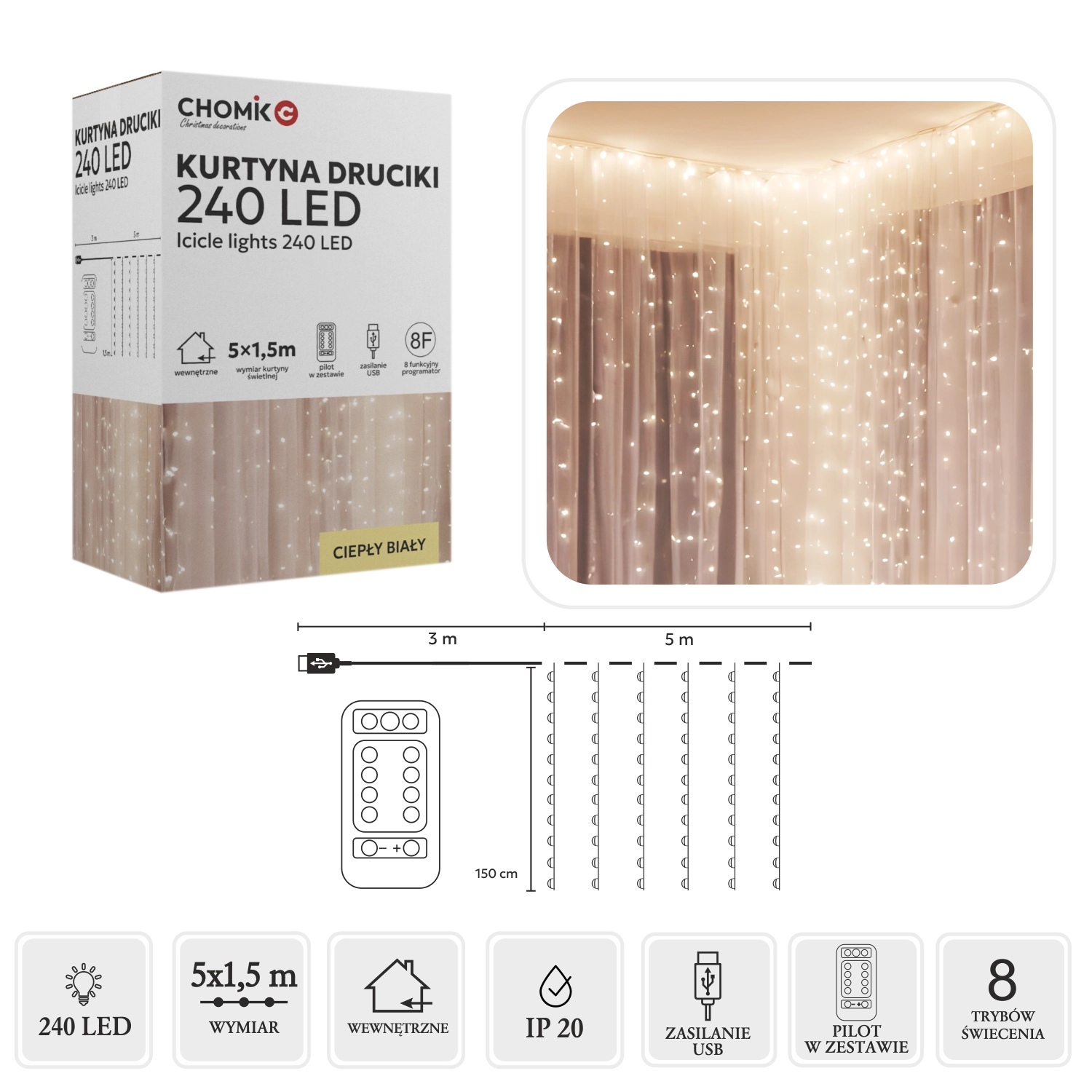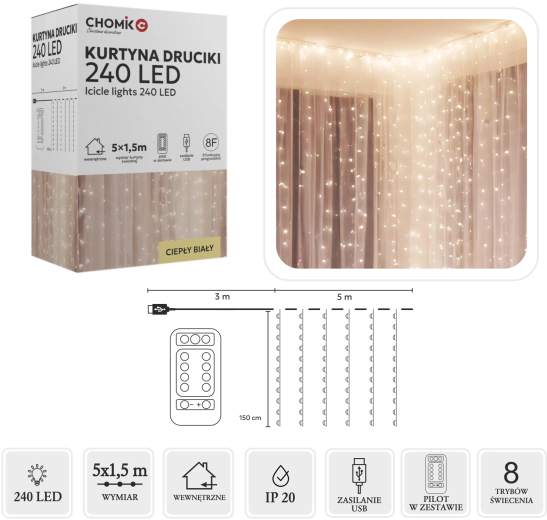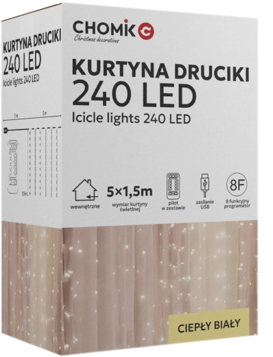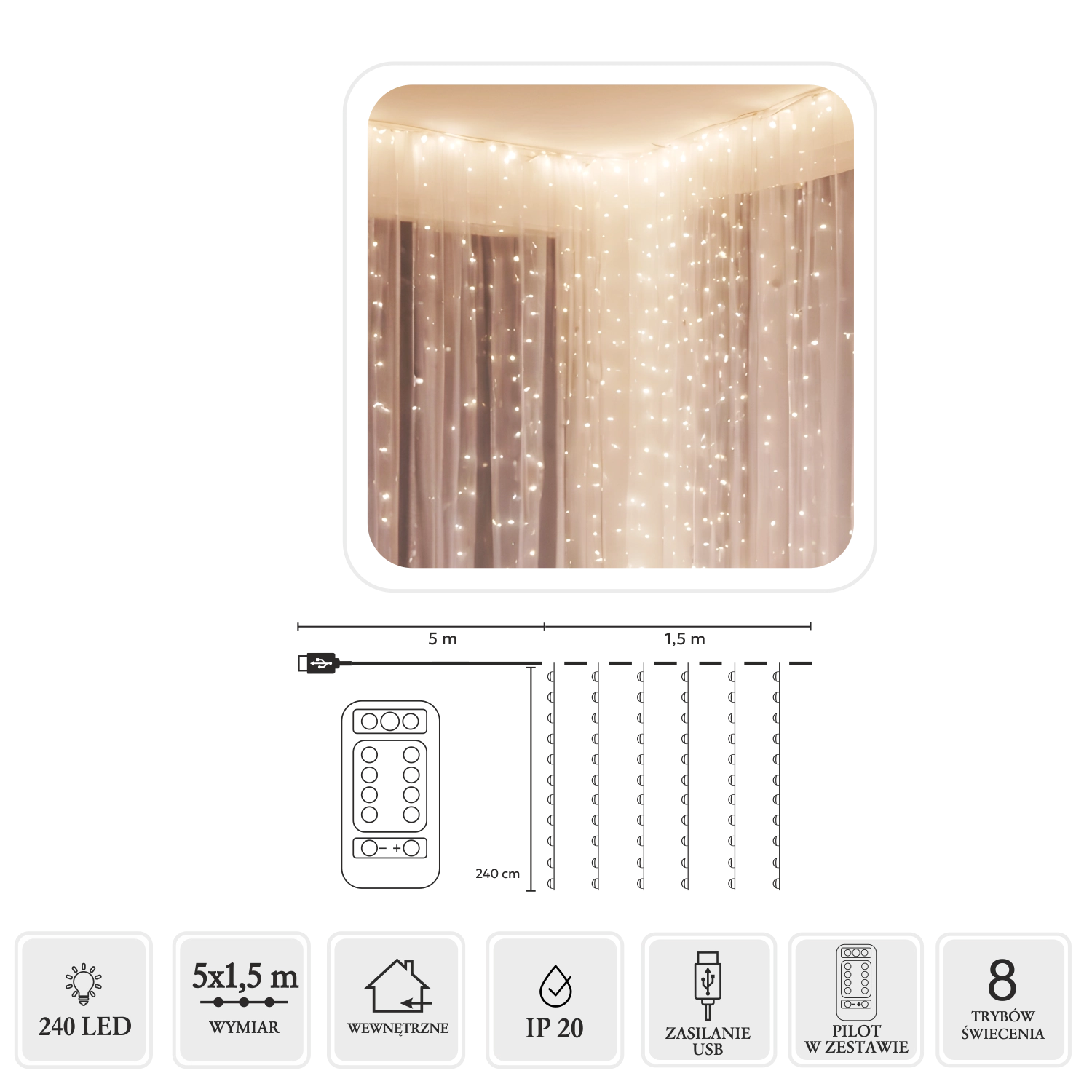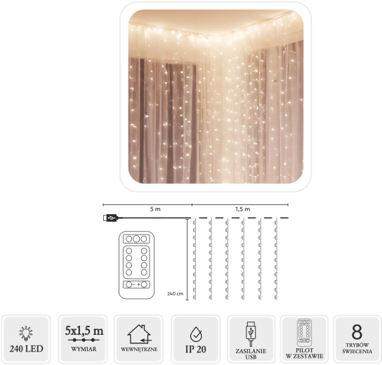 Créez une atmosphère chaleureuse à la maison comme au jardin avec ce rideau lumineux doté de 240 micro LED en blanc chaud. Dimensions 5 x 1,5 m, fins fils argentés, alimentation USB et télécommande avec 8 modes pour un contrôle facile. Grâce à l’indice IP44, il convient aussi à une utilisation en extérieur.