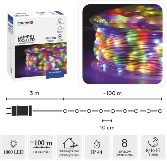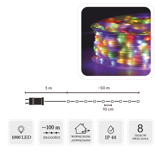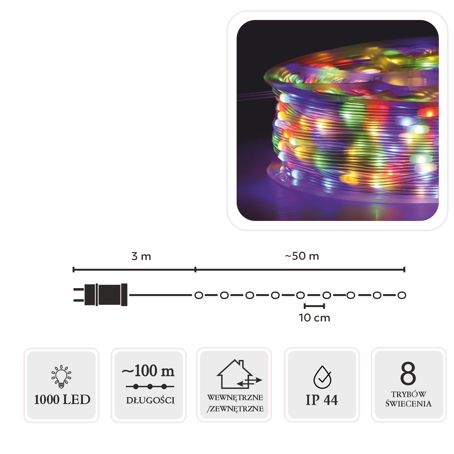 Illuminez votre maison et votre jardin avec une guirlande LED extra longue de 100 m équipée de 1000 micro LED en version multicolore. Grâce au câble transparent, la lumière reste pure, tandis que 8 modes avec mémoire et un minuteur 8/16 h assurent un contrôle pratique. Une bobine est incluse pour un déroulement et un rangement faciles, adaptée à l’intérieur comme à l’extérieur (IP44).