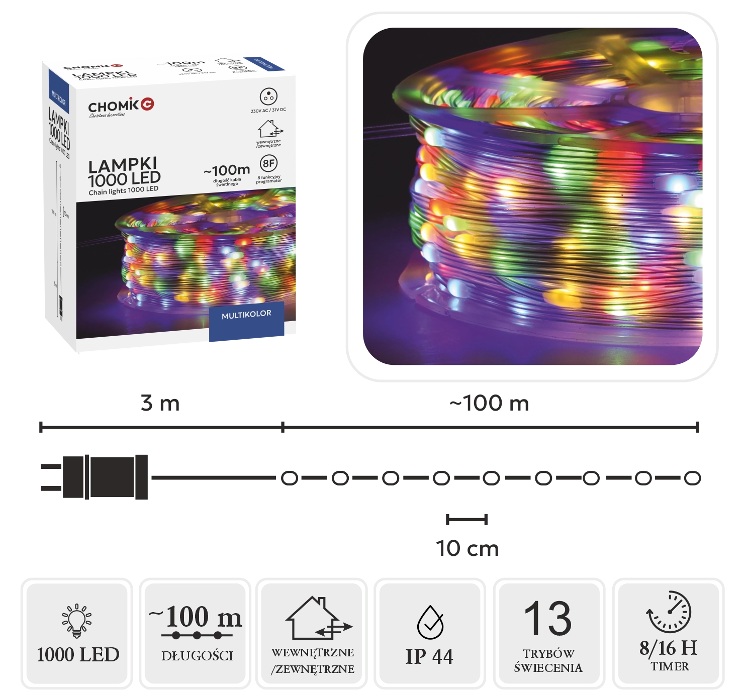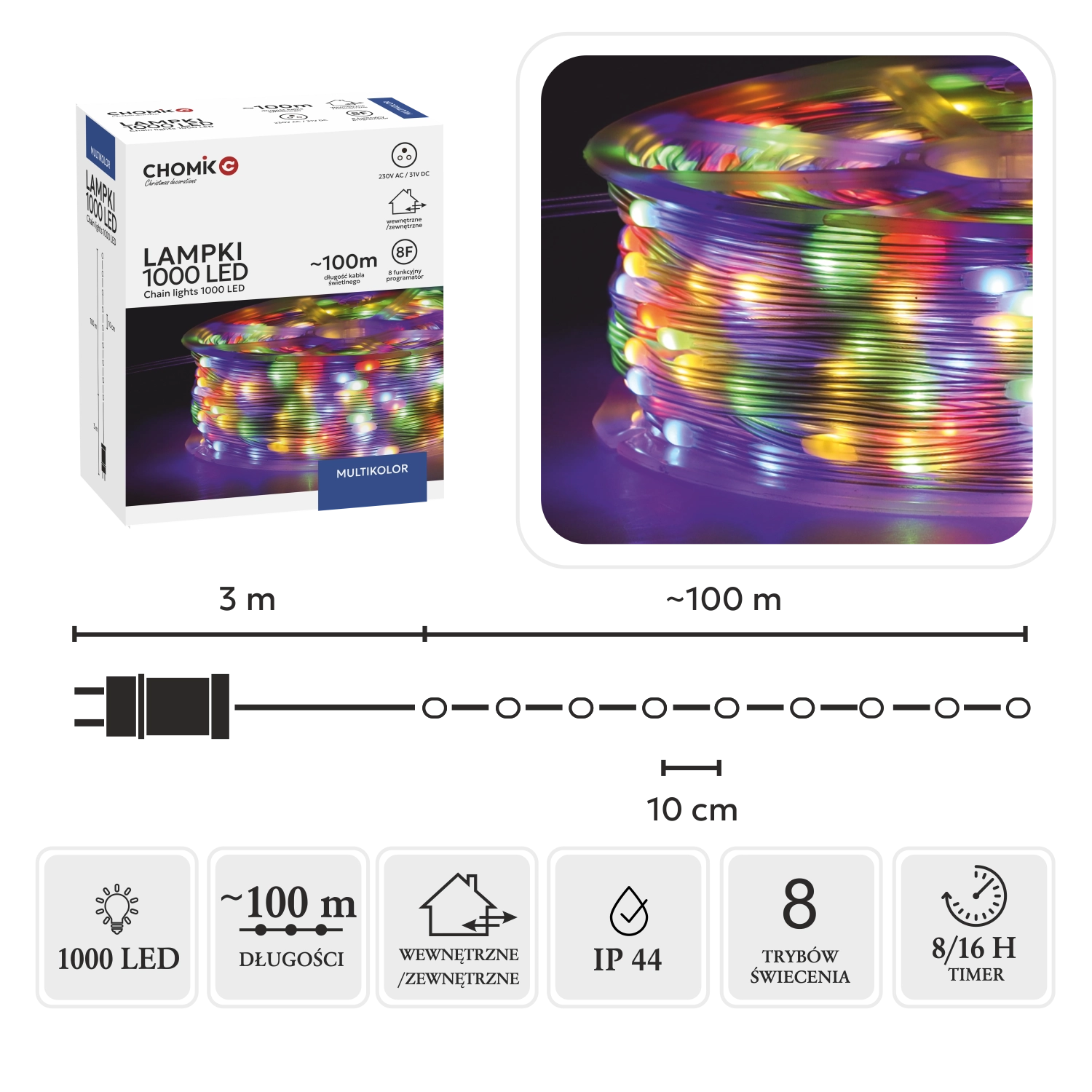 Créez une décoration lumineuse spectaculaire pour les fêtes, mariages, soirées ou comme ornement saisonnier de votre maison. Cette guirlande LED micro offre des effets multicolores intenses sur 100 mètres, idéale pour décorer de grandes surfaces, des arbres ou des pergolas. Le conducteur transparent met en valeur les couleurs et la lumière sans éléments perturbateurs.