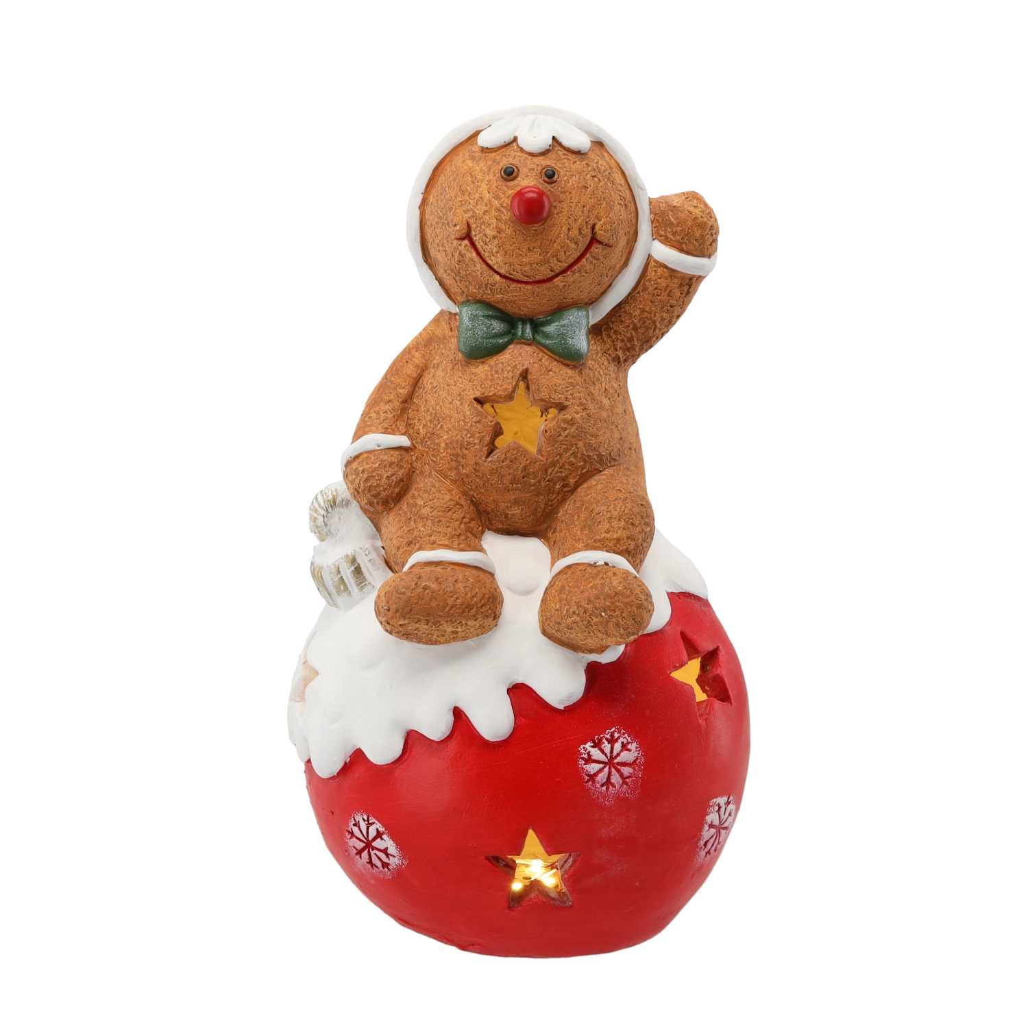Adorable décoration de Noël représentant un bonhomme en pain d’épices assis sur une boule décorative, elle apporte une atmosphère féerique à votre intérieur. L’éclairage LED intégré crée un effet chaleureux, tandis que le matériau résistant en céramique de magnésite assure stabilité et longévité. Idéale comme décoration de fête sur une étagère, une commode ou un rebord de fenêtre.