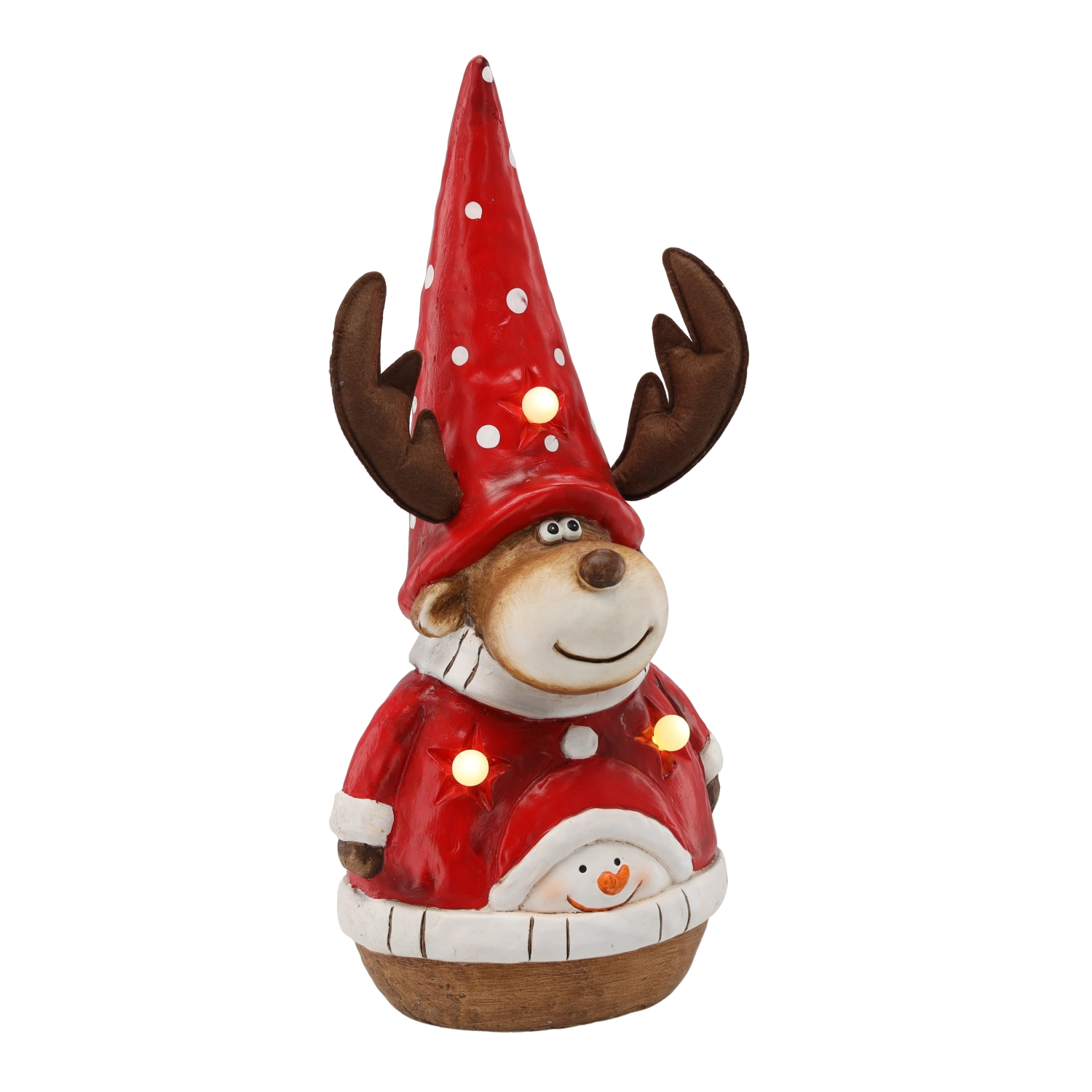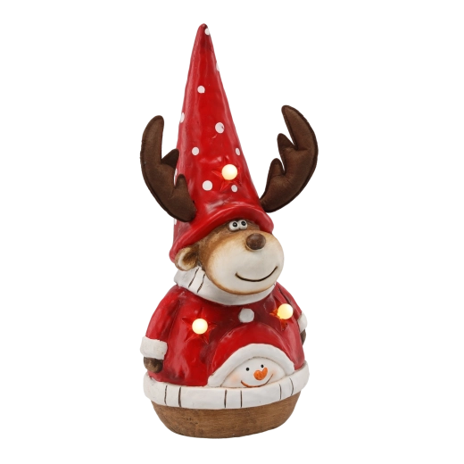 Adorable décoration de Noël en forme de renne avec bonnet qui illuminera votre intérieur grâce à son éclairage LED intégré. Conception stable en céramique de magnésium résistante, alimentation pratique par 3 piles AAA et dimensions universelles 26 × 16,5 × 48 cm en font un complément idéal pour une commode, sous le sapin ou dans l’entrée.