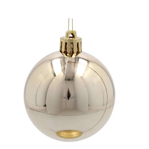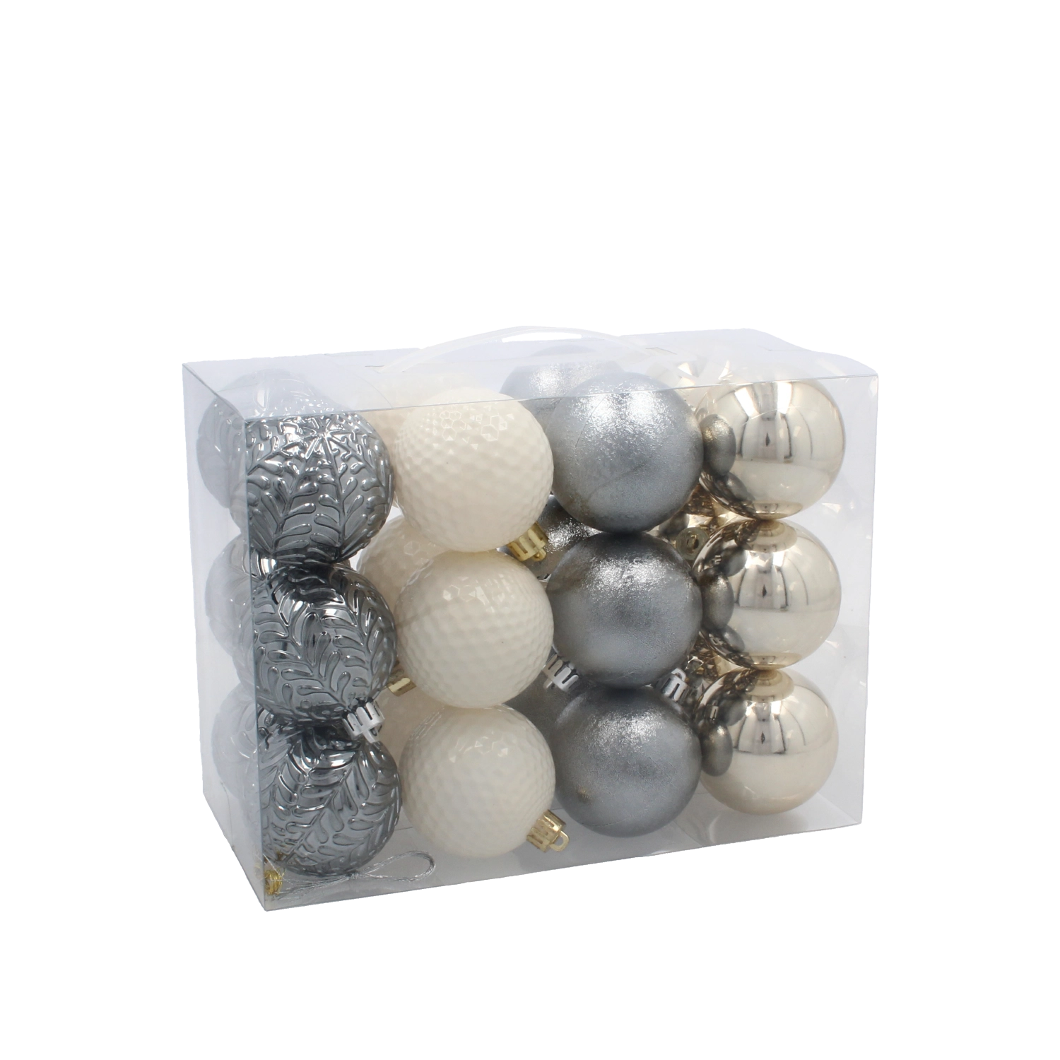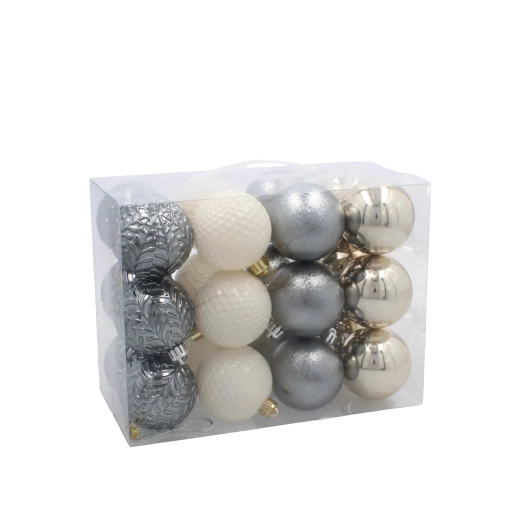 Offrez à vos fêtes de fin d’année une élégance intemporelle. Ce set soigneusement assorti de 24 boules en plastique dans les couleurs champagne, gris et blanc propose une combinaison équilibrée de surfaces brillantes, mates et pailletées, apportant profondeur, reflets lumineux et look premium.