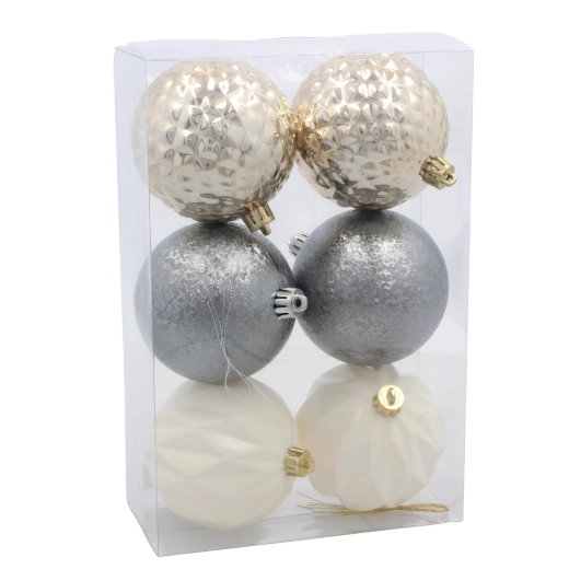 Ce set de boules en verre, soigneusement assorti, combine des surfaces texturées, mates et lisses pour un effet moderne et délicat. La palette champagne, argent et blanc se marie facilement avec d’autres décorations et crée un rendu cohérent sans surcharge visuelle.