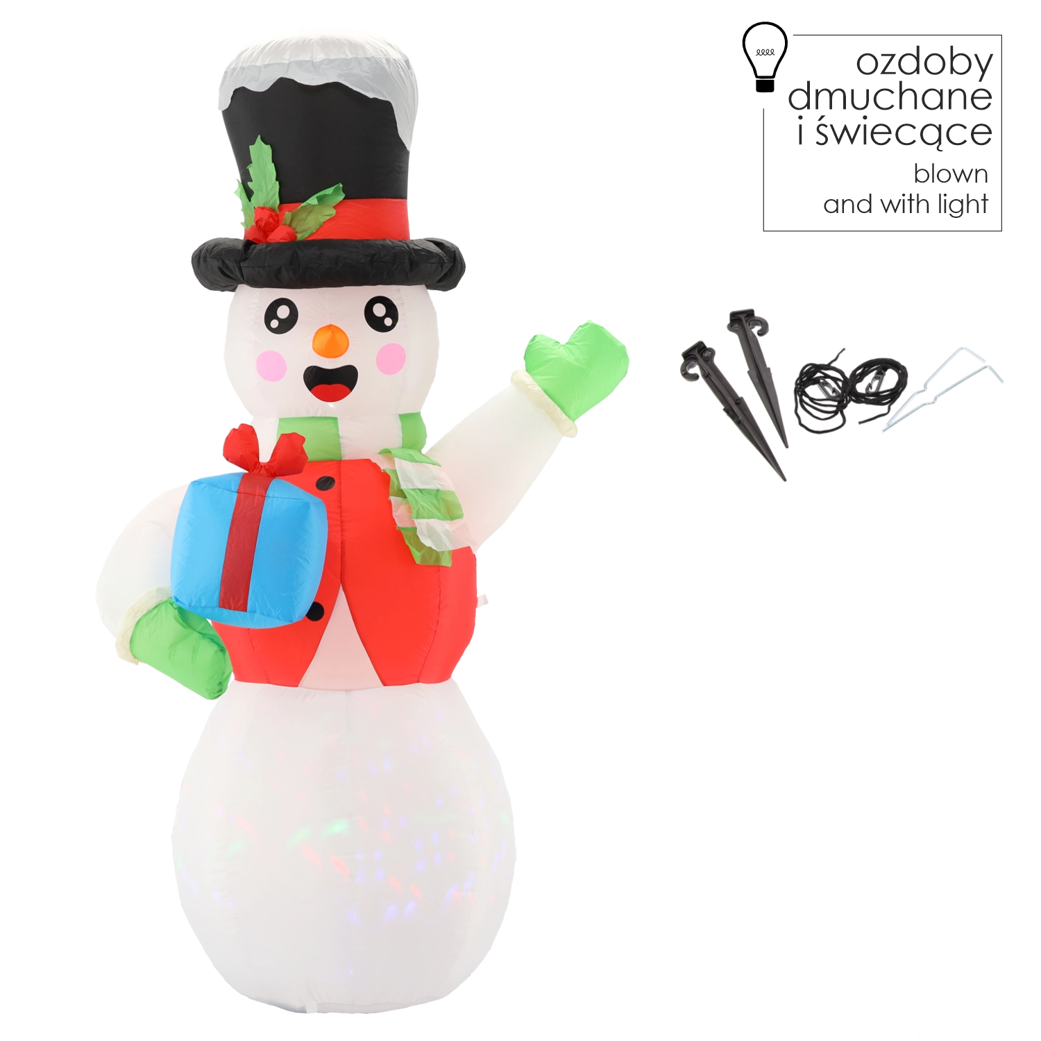 Éblouissez voisins et passants avec une décoration de Noël spectaculaire qui se gonfle toute seule en un instant et s’illumine. Le grand bonhomme de neige avec chapeau noir, écharpe et cadeau à la main offre des effets lumineux féeriques grâce à la combinaison d’une LED blanche et d’un éclairage multicolore rotatif.