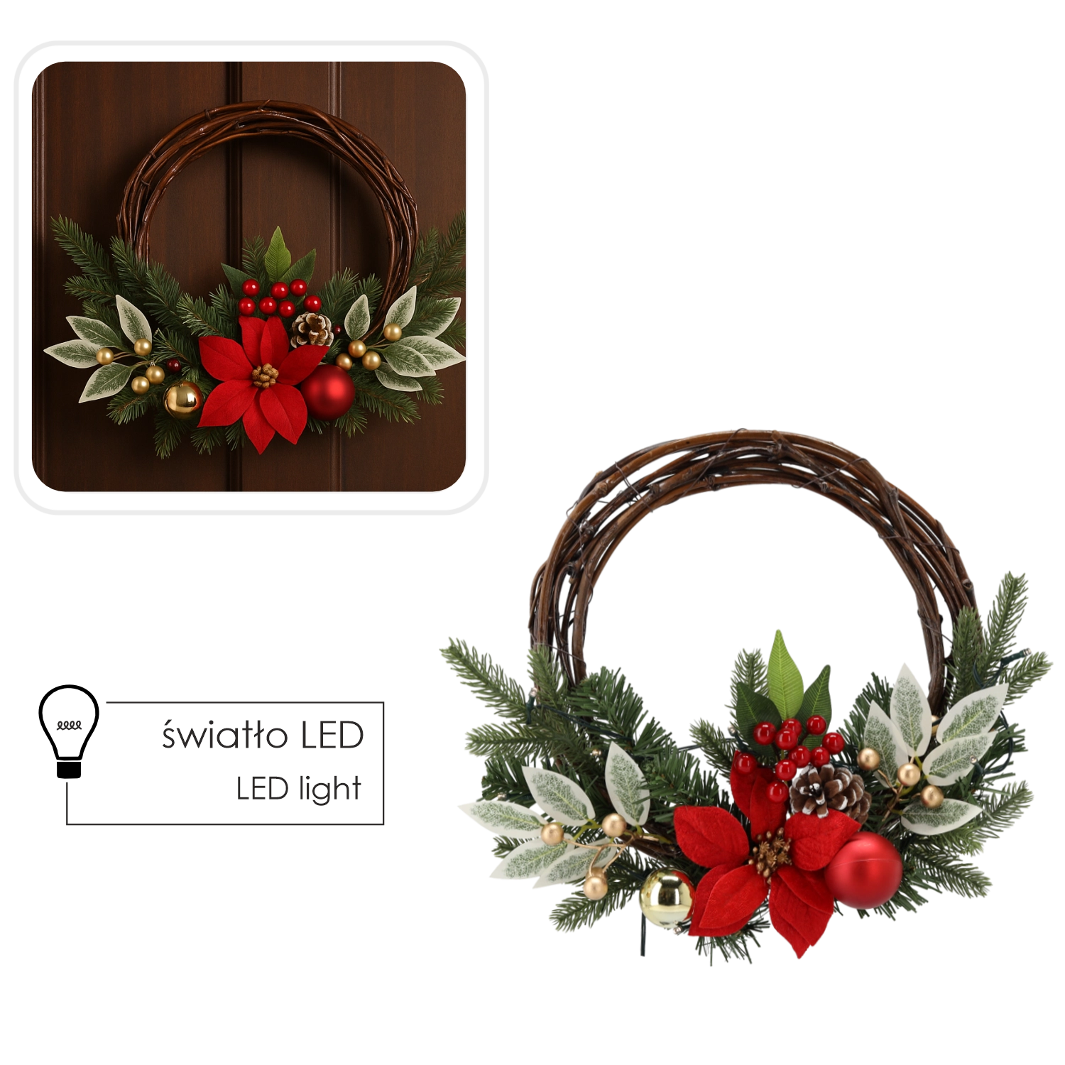 Apportez une touche de magie de Noël traditionnelle à votre intérieur. Cette couronne est fabriquée en osier de qualité et ornée d’un riche mélange de verdure, de baies, de pommes de pin et d’accents rouge‑or. Un éclairage LED délicat met en valeur les détails et crée un agréable décor lumineux pendant toute la période des fêtes.