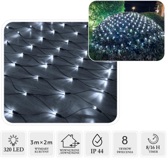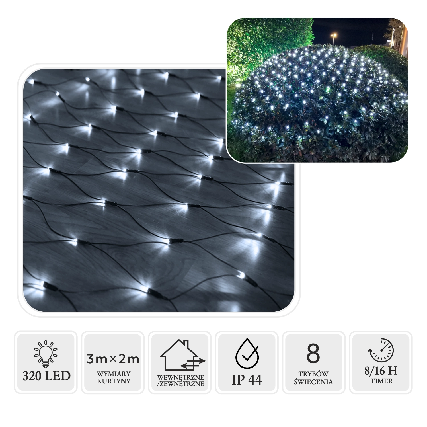 Rideau lumineux en filet LED 320 blanc froid, 3 × 2 m, intérieur et extérieur