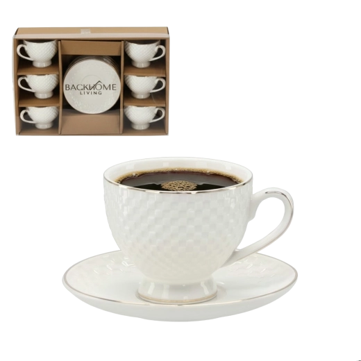 Ce set de tasses avec soucoupes allie harmonieusement élégance et praticité. La surface à relief crée une texture attrayante et le liseré doré souligne l’aspect luxueux qui se distingue sur toute table.