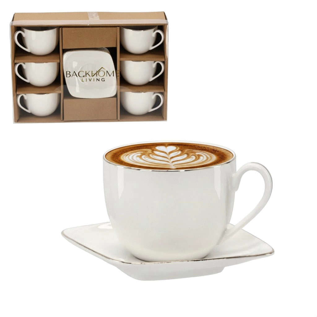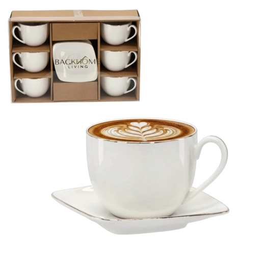 Un élégant set de six tasses avec soucoupes de 250 ml, parfait pour le café quotidien comme pour les moments festifs. Son design intemporel avec un liseré décoratif doré apporte une touche de luxe à votre table, tandis que la capacité pratique de 250 ml assure un service confortable de votre café ou thé préféré.