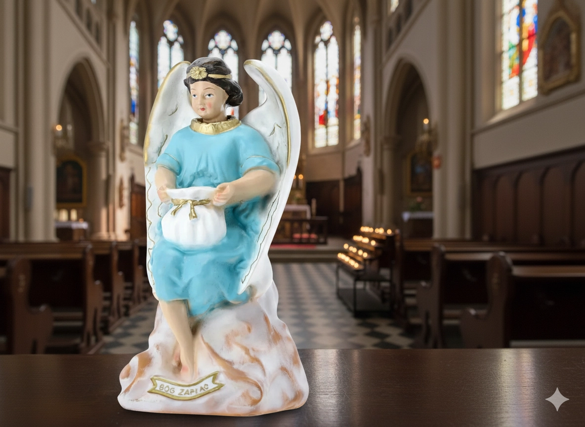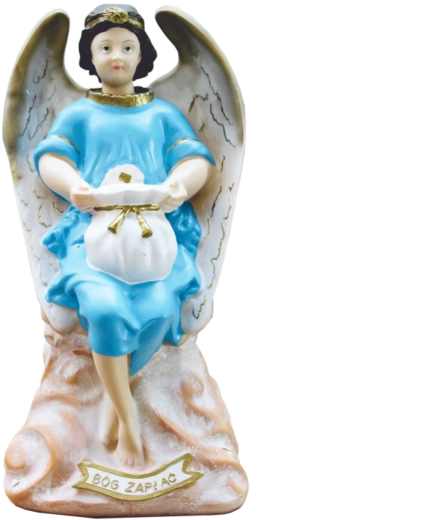Élégante statuette d’ange aux ailes blanches délicates et à la robe bleu clair, alliant beauté décorative et fonction pratique de tirelire. Des détails soigneusement peints, des accents dorés et une polyrésine résistante en font une décoration idéale pour l’appartement, une chapelle ou une table de fête ainsi qu’un cadeau significatif.