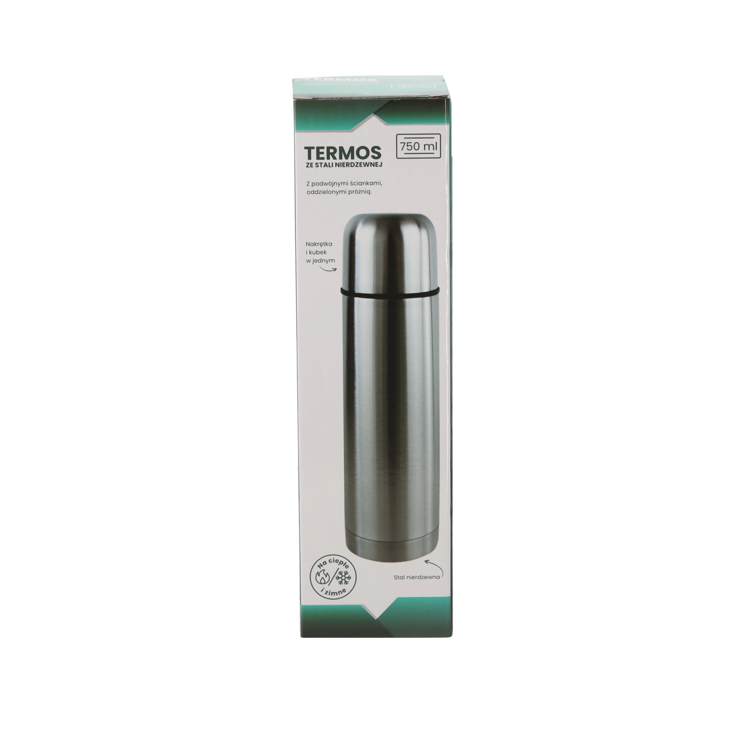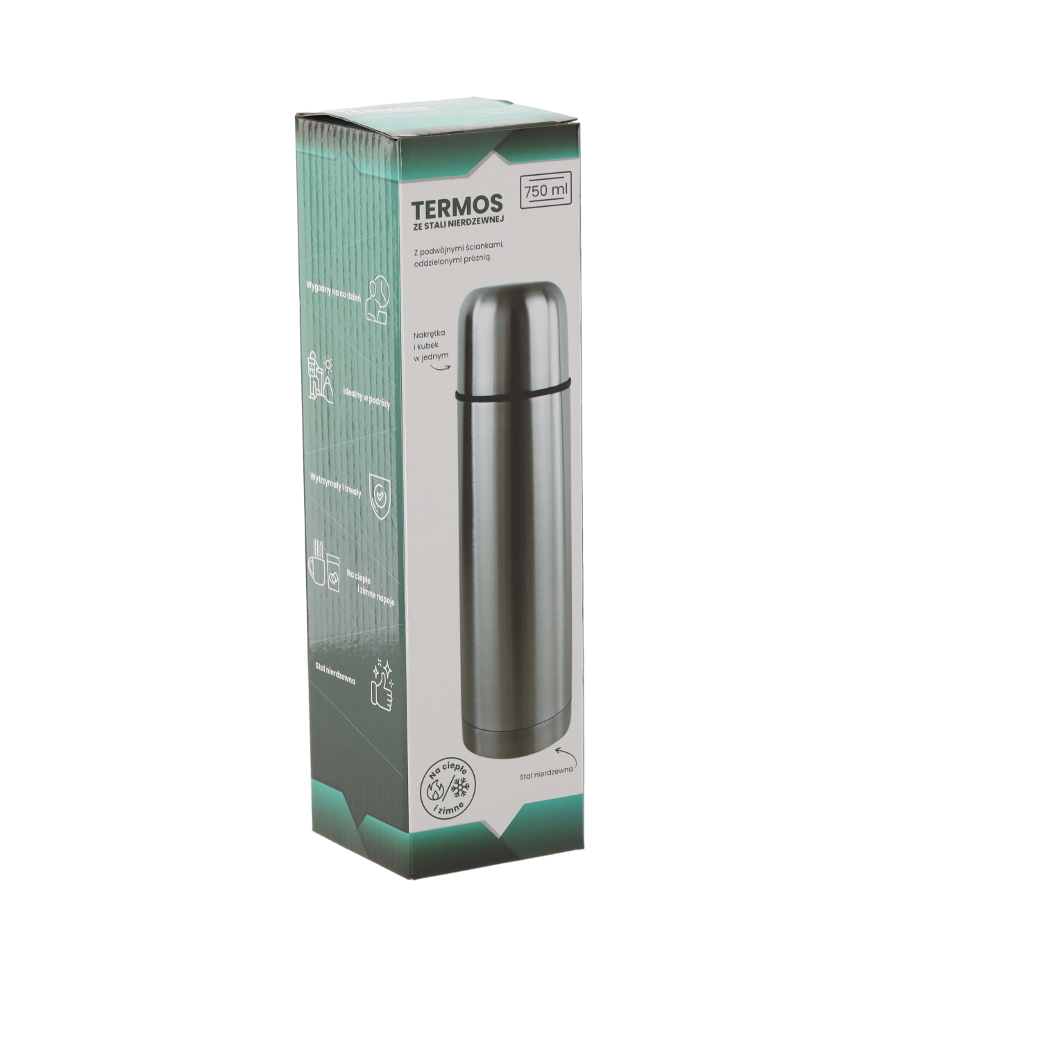 Thermos pratique de 750 ml avec une double paroi en acier inoxydable qui maintient vos boissons chaudes ou froides pendant longtemps. Il offre une excellente isolation thermique – après 24 heures, la boisson reste autour de 40–43 °C. Son format ergonomique et sa fabrication de qualité garantissent une durabilité et une utilisation confortable à la maison, au travail et en voyage.