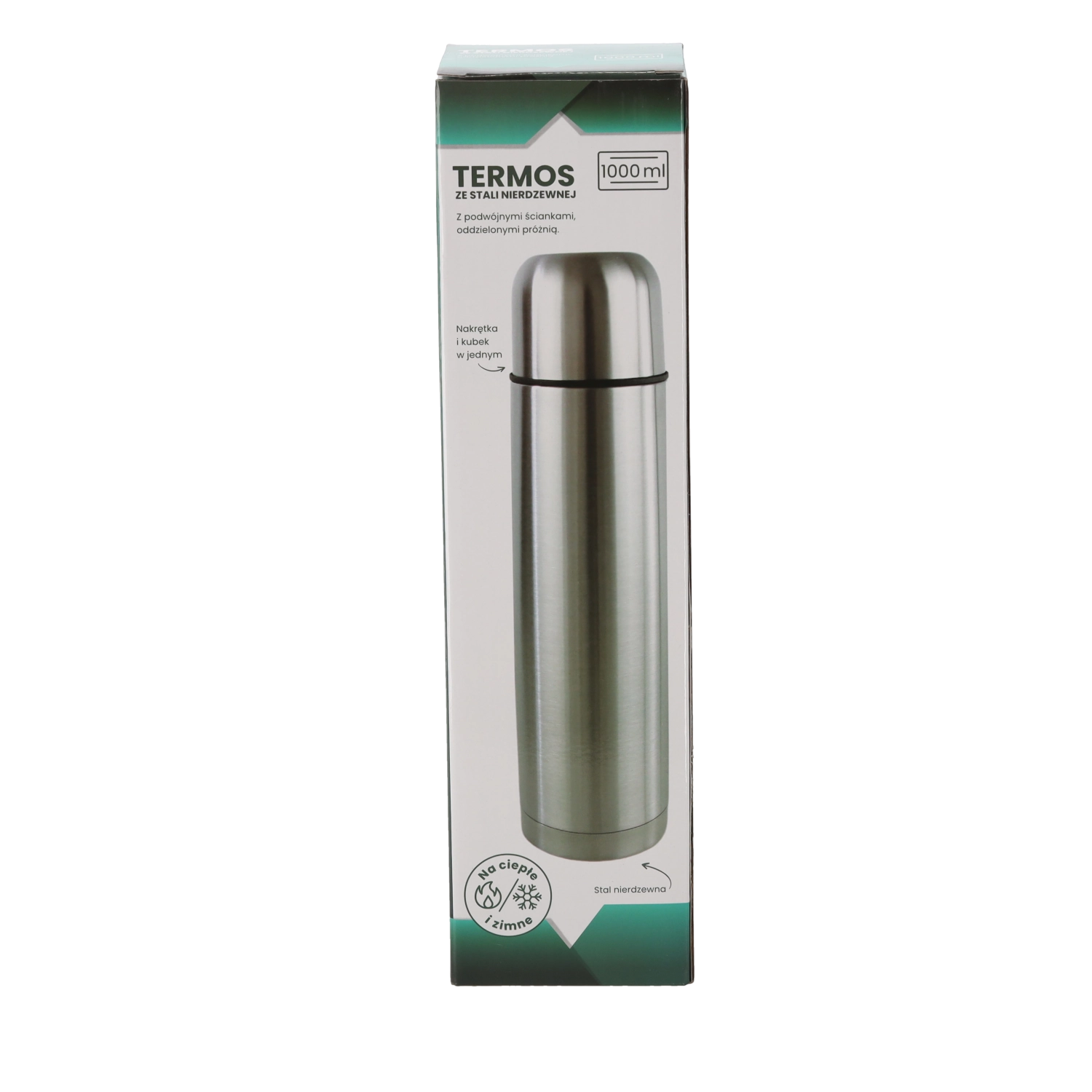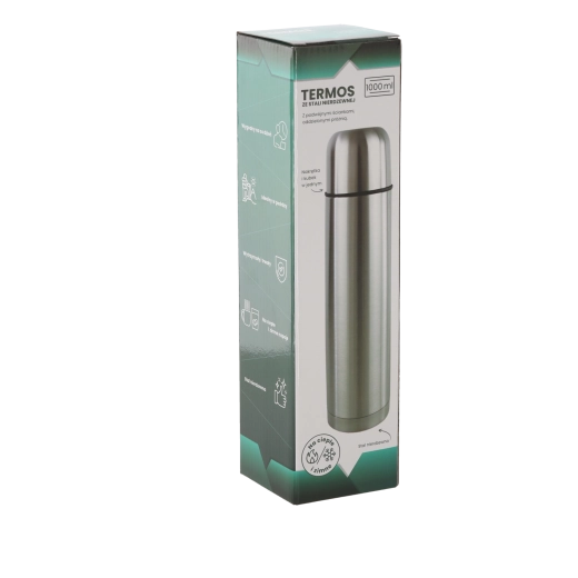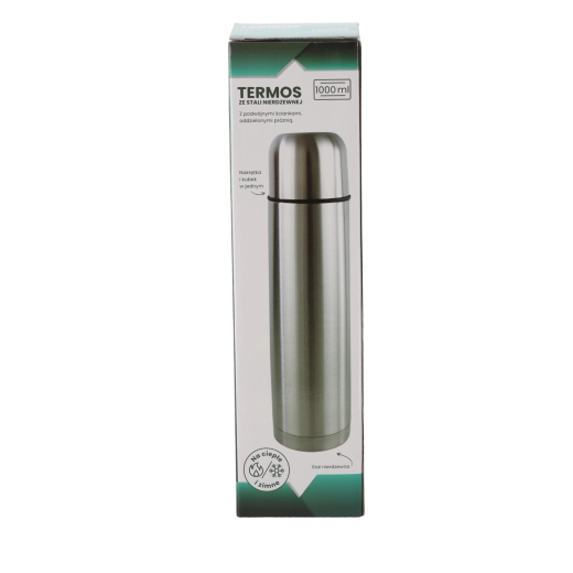 Thermos pratique d’un volume de 1000 ml en acier inoxydable avec double paroi, qui maintient les boissons chaudes longtemps. Pour une température initiale de 96 °C, il conserve après 24 heures encore 40–43 °C. Idéal pour les voyages, le travail et les excursions.