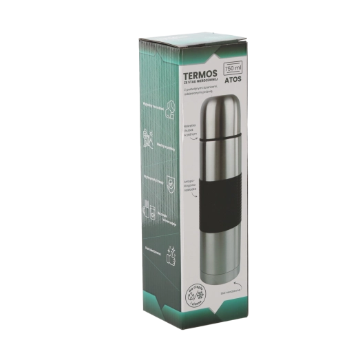Découvrez la thermos ATOS 750 ml, fiable au quotidien – au travail, en voyage ou en plein air. Grâce à sa double paroi en acier inoxydable, elle offre d'excellentes propriétés isolantes et une résistance aux chocs et à la corrosion. La poignée en silicone antidérapante assure une prise en main sûre.