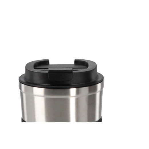 Un mug de voyage élégant au fini acier original, idéal pour le café chaud comme pour les boissons froides. La double paroi à isolation sous vide aide à maintenir la température plus longtemps, tandis que la bande en silicone texturée garantit une prise sûre et antidérapante.