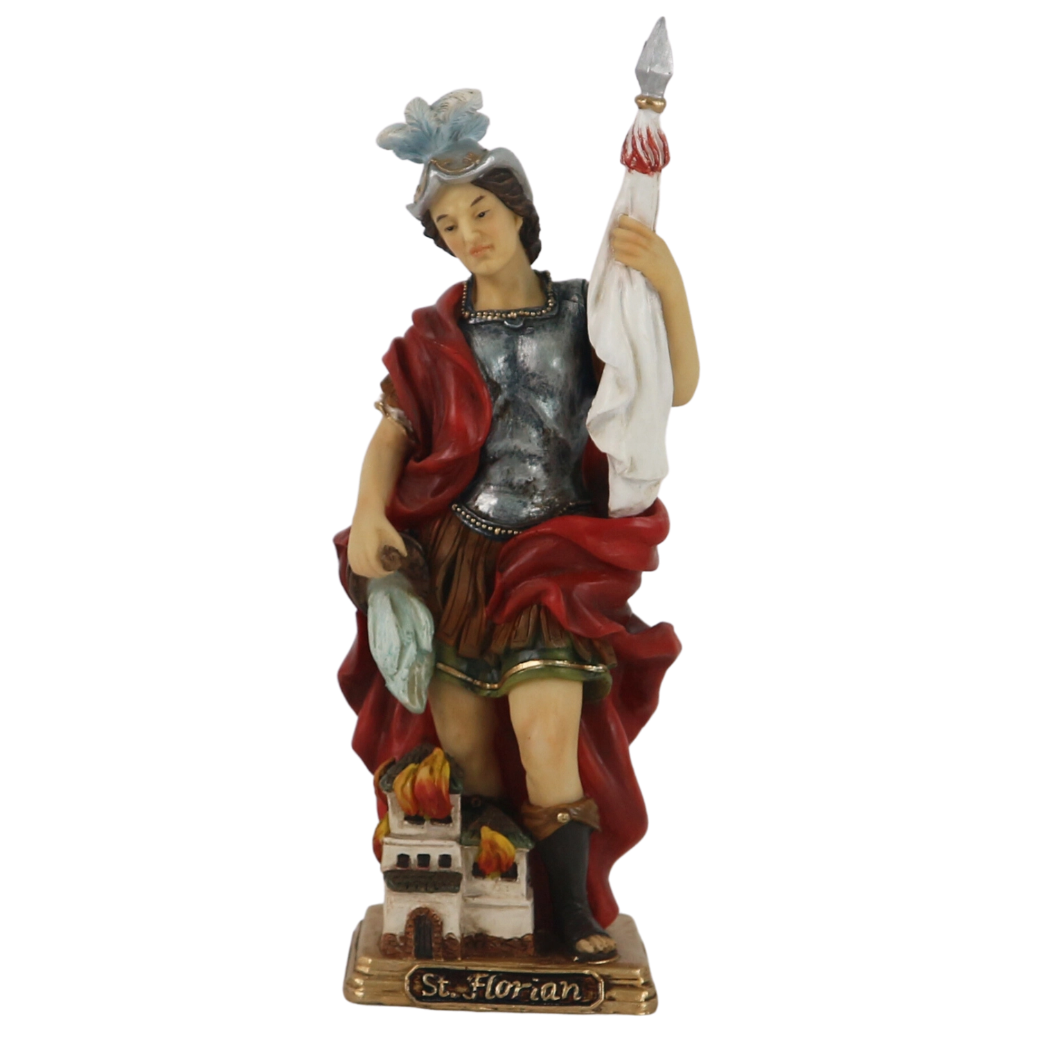 La statuette de saint Florian en armure, avec manteau et bannière, se distingue par sa peinture manuelle et ses détails soigneusement sculptés, qui donnent à la figure relief et profondeur.