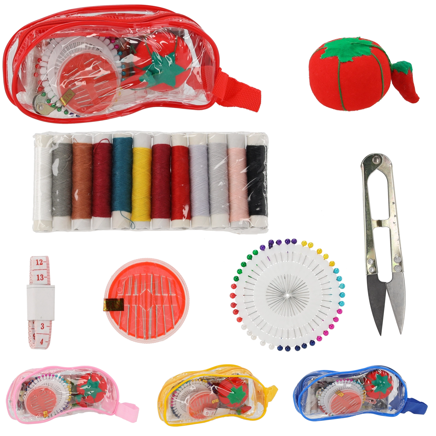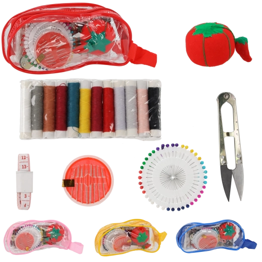 Pratique kit de couture avec 6 éléments essentiels pour des réparations rapides et la couture créative à la maison comme en voyage. Contient 16 aiguilles, un mètre ruban 150 cm, des ciseaux, 12 bobines de fil de 10 m de différentes couleurs, un porte-aiguilles et 40 épingles à tête perlée. Le tout est rangé de manière claire dans une trousse zippée transparente pour un transport et une organisation faciles.