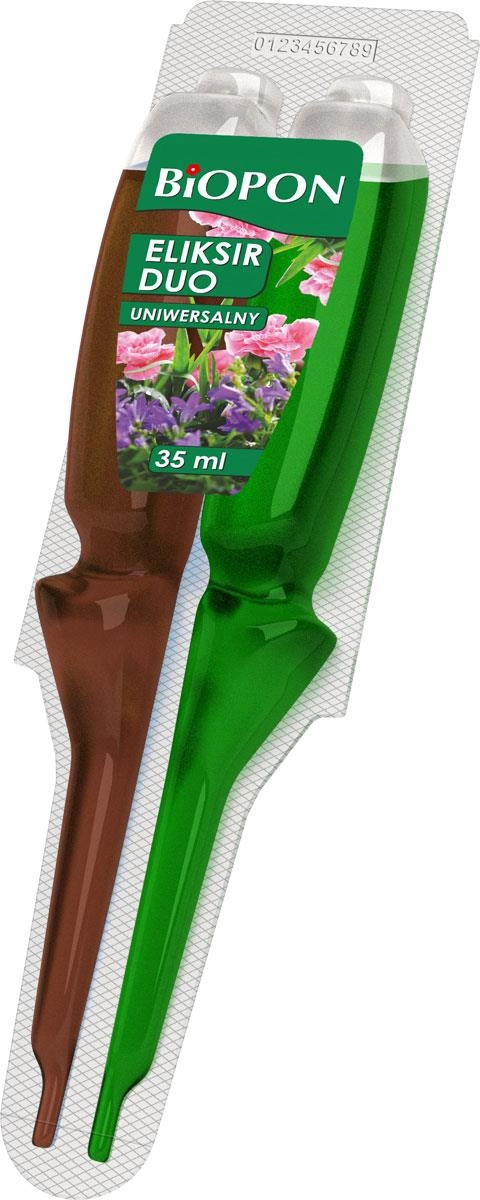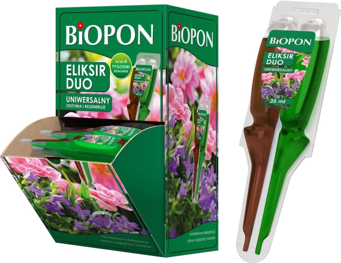 Biopon Élixir Duo est une solution astucieuse pour les plantes ornementales à croissance faible ou à floraison insuffisante. Deux chambres séparées conservent les ingrédients actifs individuellement, garantissant ainsi leur stabilité et haute efficacité. Le mélange s’effectue uniquement dans le substrat, où l’élixir agit de manière ciblée et synergique – le résultat est une condition visiblement améliorée, des feuilles aux couleurs plus intenses et une floraison plus longue et plus riche.