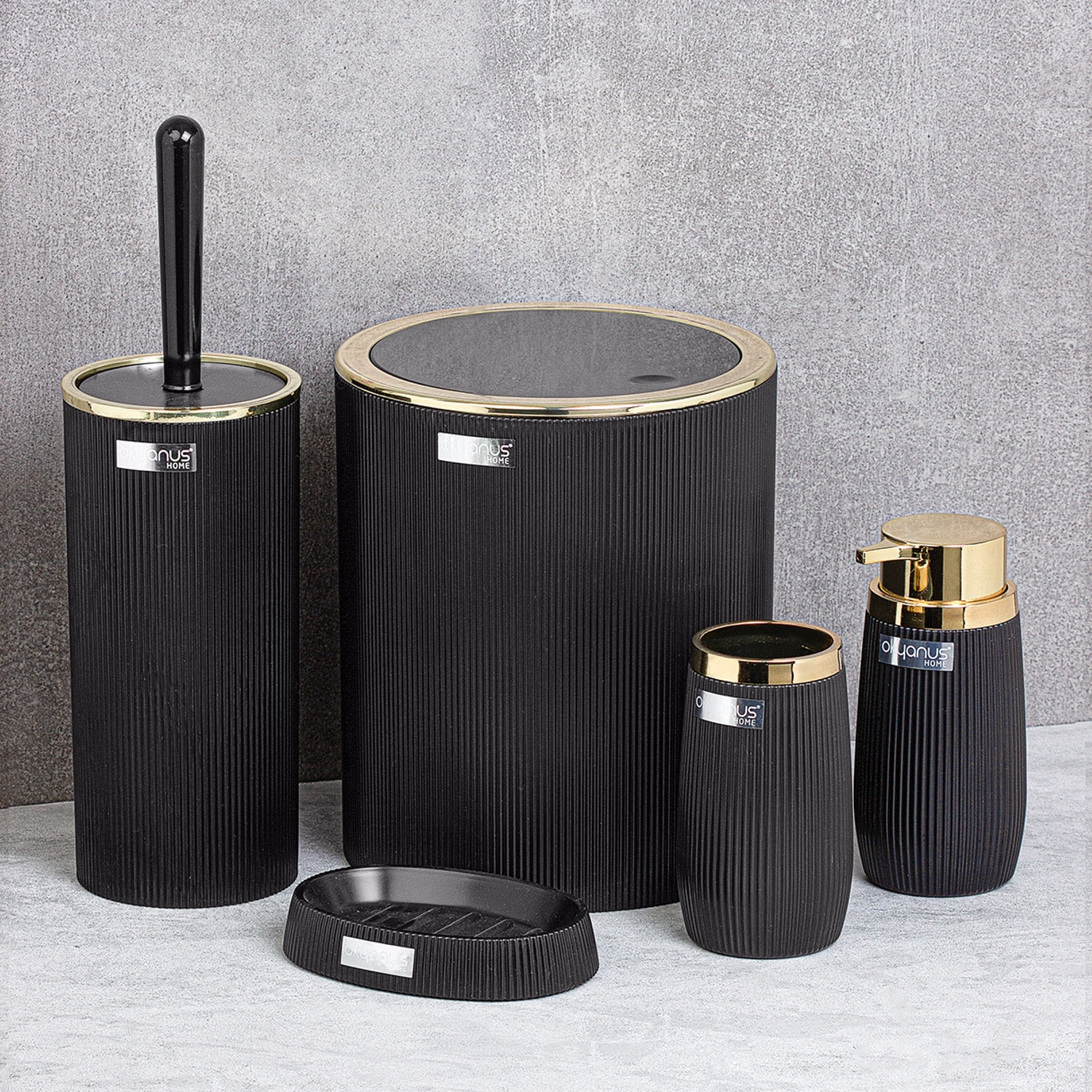 Ce set design combine une finition noire moderne avec des accents dorés, conférant une touche premium à votre intérieur. Grâce à sa fabrication en plastique de qualité, chaque élément est facile à nettoyer et adapté à un usage quotidien.