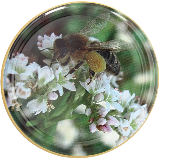 Pratique lot de 10 couvercles de diamètre 82 mm avec un motif attrayant d’abeille sur des fleurs pour des bocaux de miel et d’autres produits faits maison. Couvercles de type Twist-off en tôle étamée avec joint en silicone assurant une fermeture solide et hermétique. Adaptés au traitement à froid et à chaud, y compris stérilisation et pasteurisation.