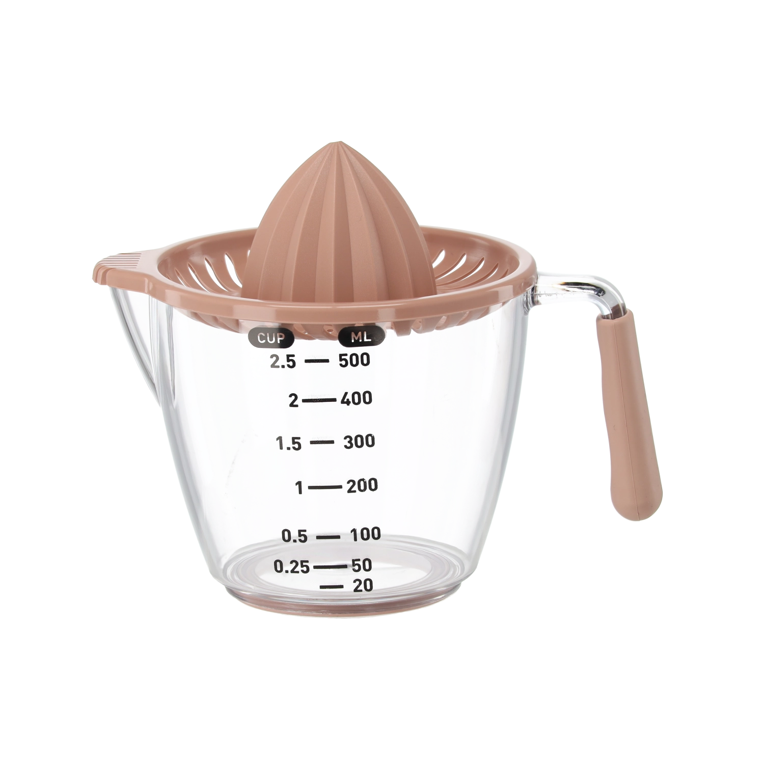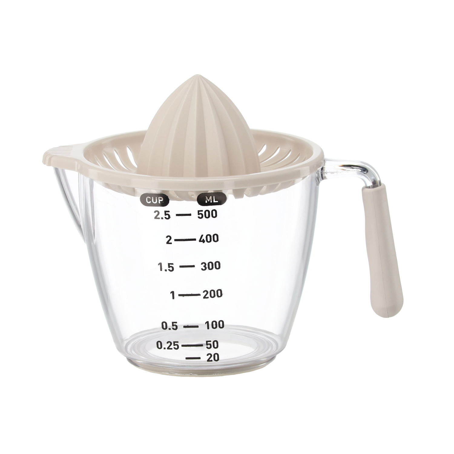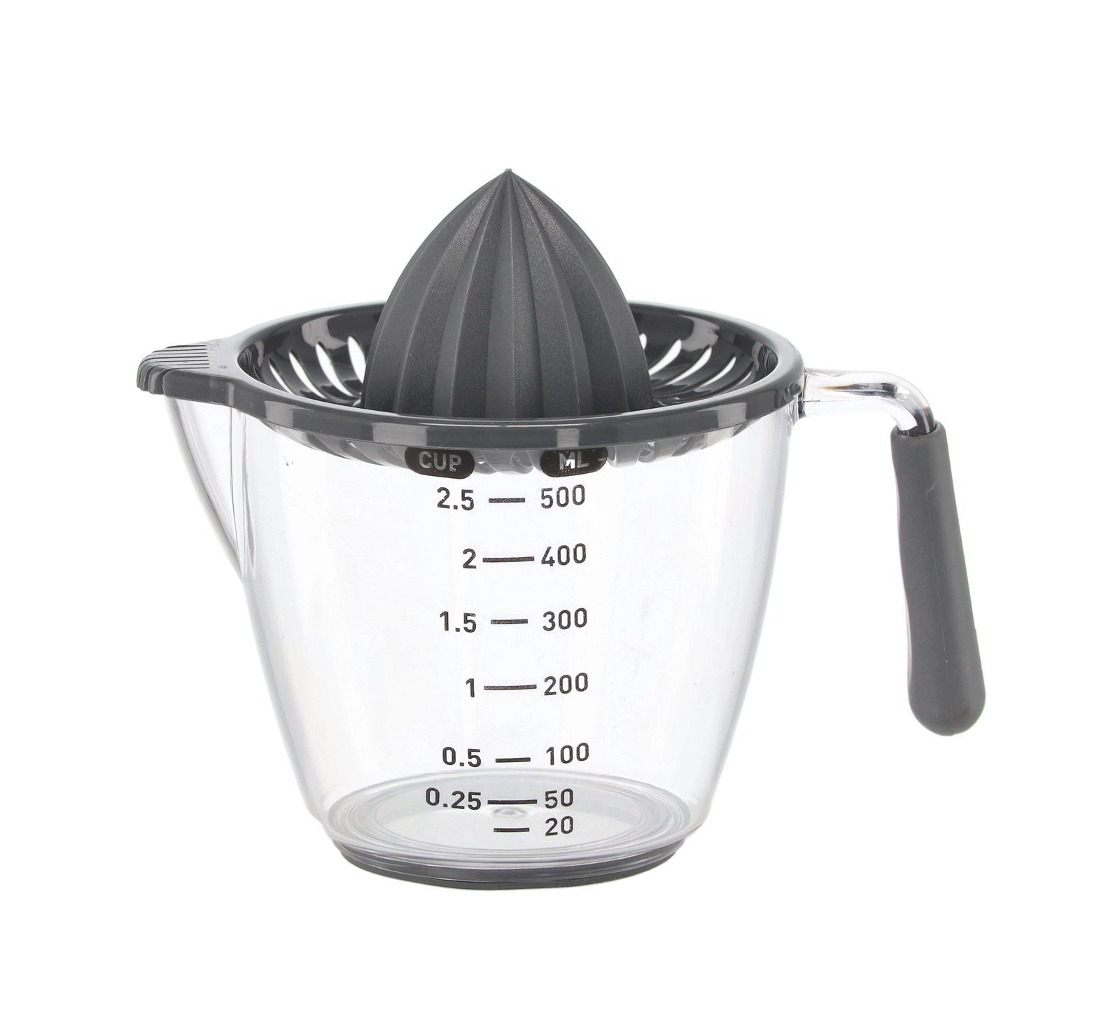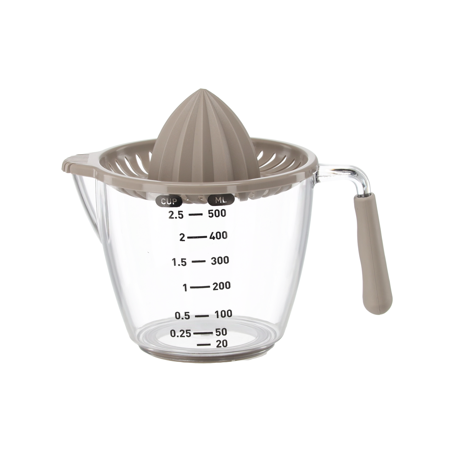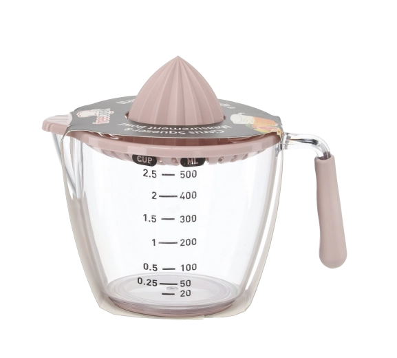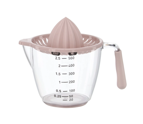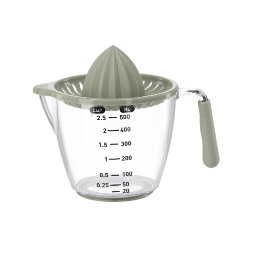 Ce presse-agrumes manuel compact permet de presser citrons, citrons verts et oranges directement dans la carafe doseuse transparente avec graduations en millilitres et en cups. Le cône rainuré extrait efficacement le jus tandis que le filtre retient pépins et pulpe. Grâce à la poignée confortable et au bec pratique, vous versez sans gouttes ni salissures.