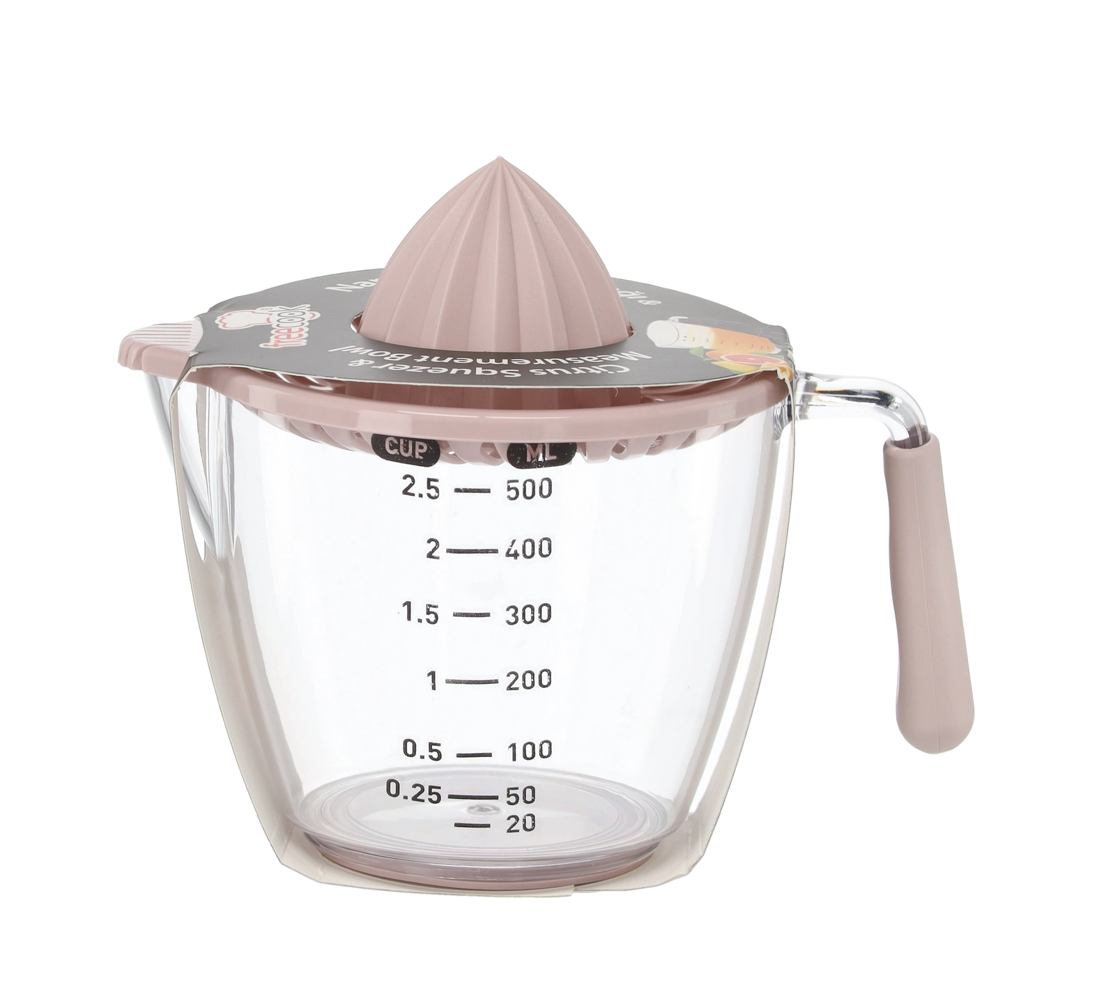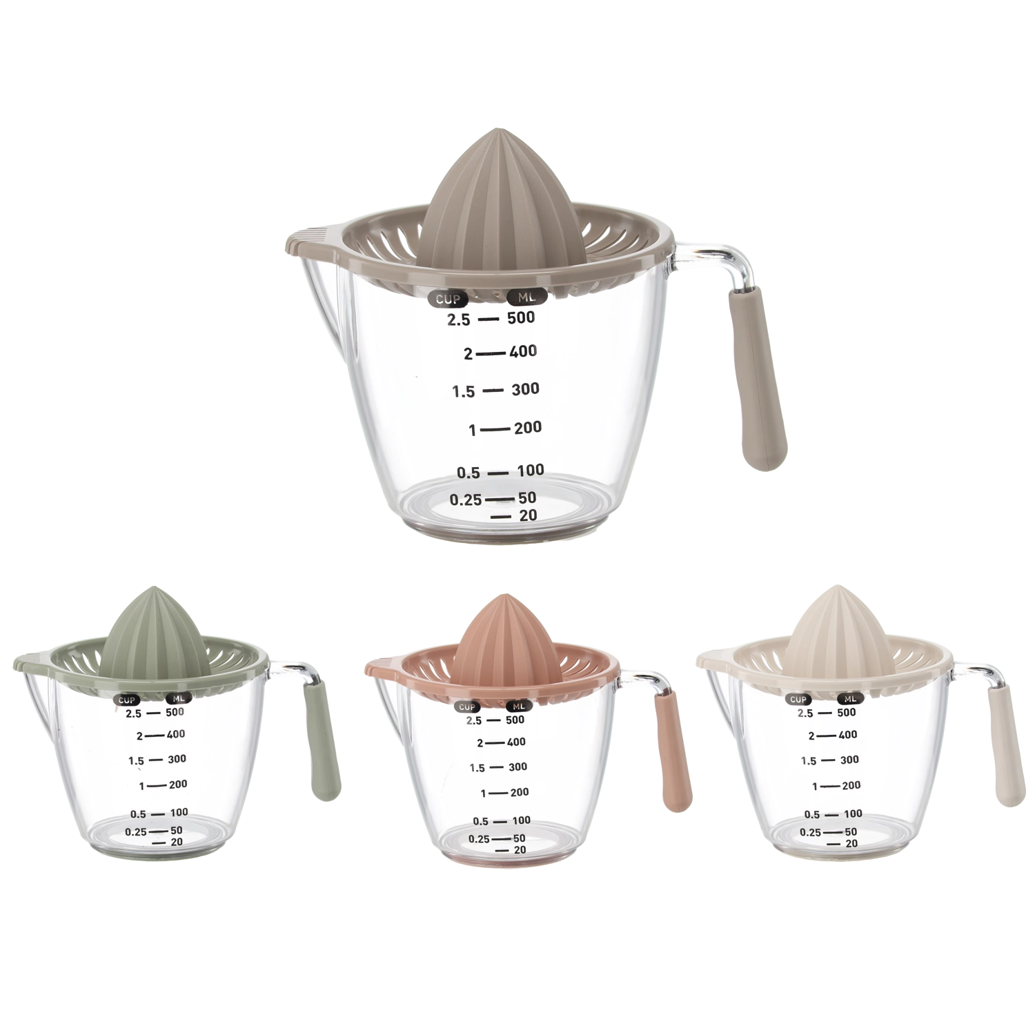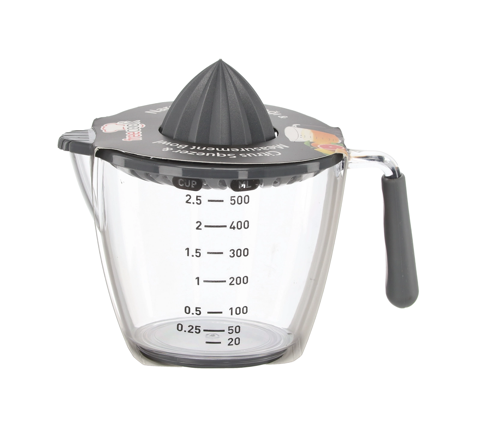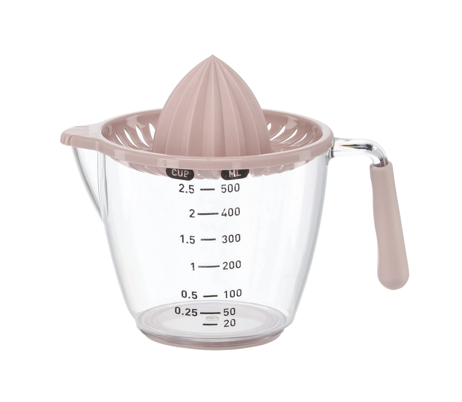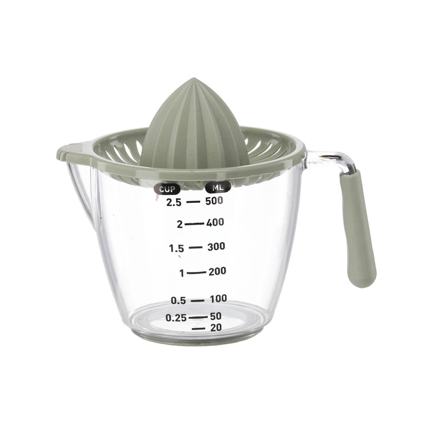 Ce presse-agrumes manuel compact permet de presser citrons, citrons verts et oranges directement dans la carafe doseuse transparente avec graduations en millilitres et en cups. Le cône rainuré extrait efficacement le jus tandis que le filtre retient pépins et pulpe. Grâce à la poignée confortable et au bec pratique, vous versez sans gouttes ni salissures.